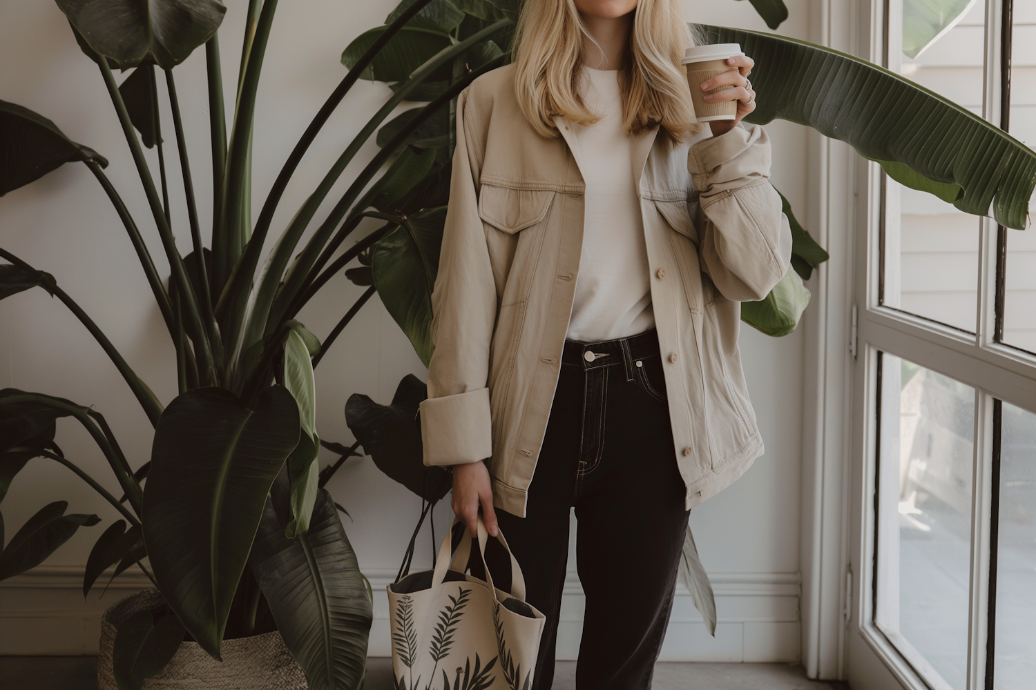 Woman in beige jacket holding coffee and tote bag, standing by large green plant in sunlit room.