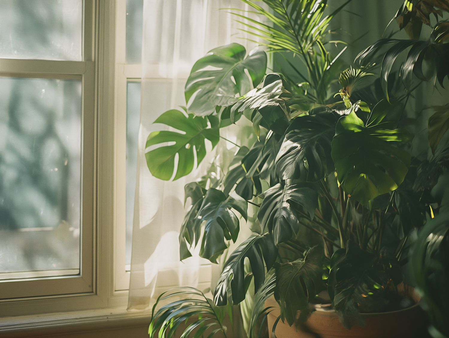 Sunlit indoor Monstera plant with large green leaves near a window with sheer curtains, creating a serene and natural atmosphere.