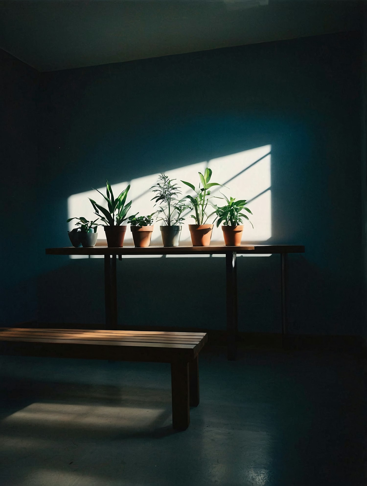 Minimalist room with potted plants on a table, sunlight casting shadows on a blue wall, and a wooden bench in the foreground.