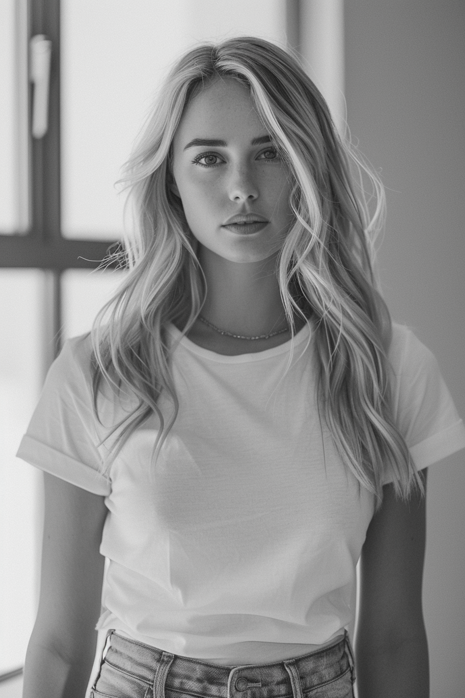 Monochrome portrait of a young woman with blonde hair in a white t-shirt, exuding elegance and calmness.