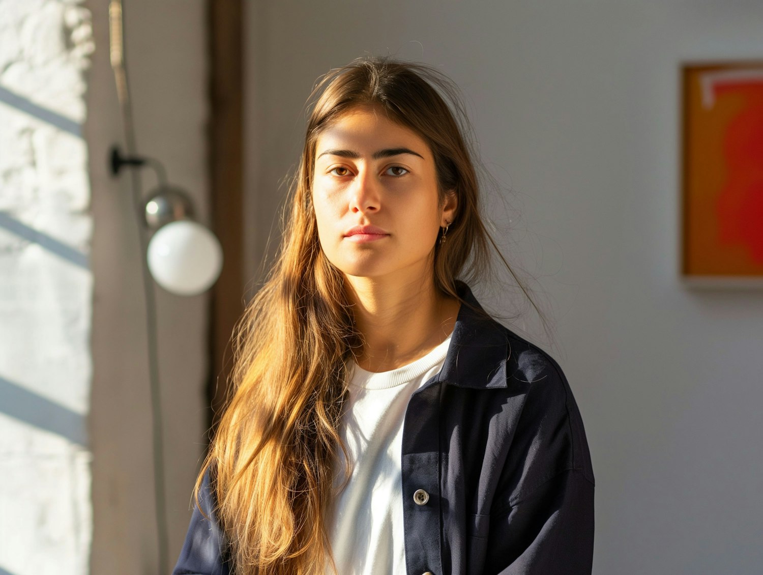 Young woman with long hair in a softly lit room, wearing a dark jacket. Sunlight casts gentle shadows, creating a serene atmosphere.
