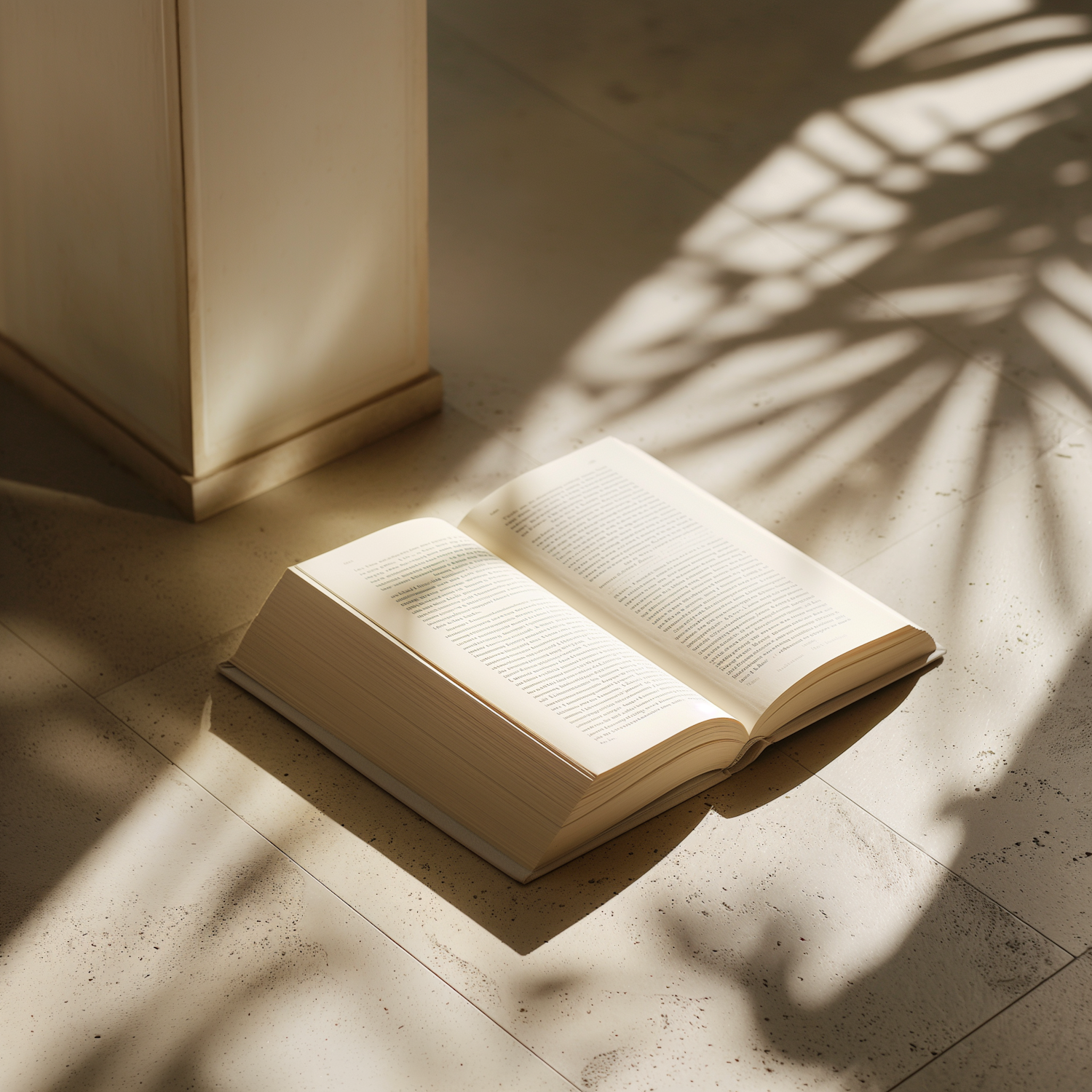 Open book on a sunlit floor with leaf shadows, creating a serene and artistic atmosphere perfect for reading.