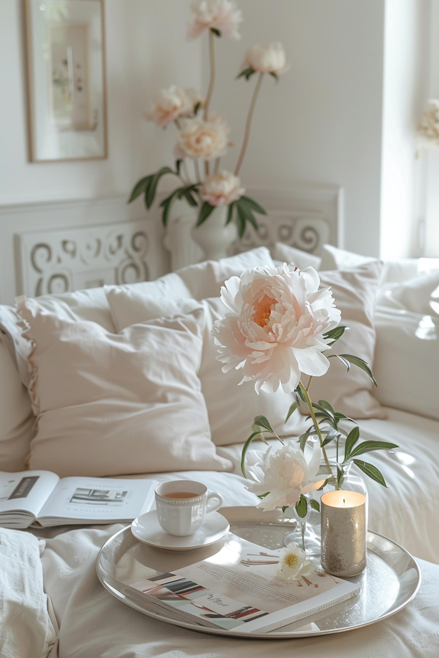Elegant white sofa with peonies, tea, and candle on a silver tray. A serene and cozy setting for relaxation.