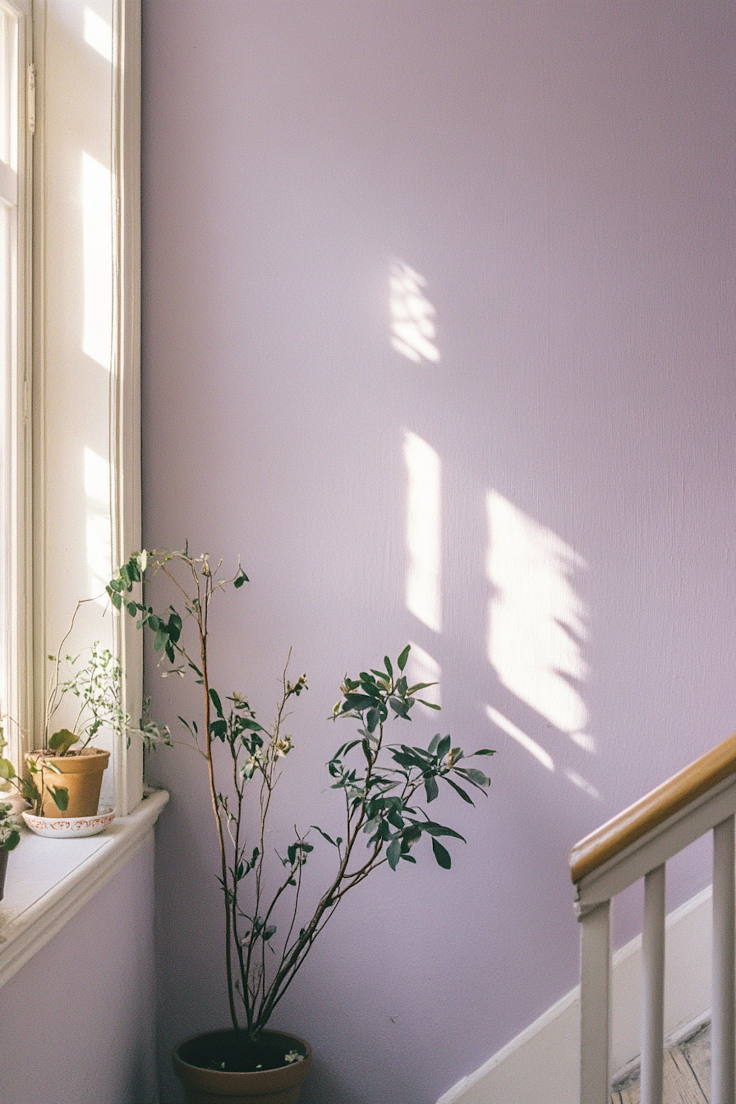 Soft sunlight filters through a window, casting shadows on a lavender wall with potted plants and a staircase handrail in view.