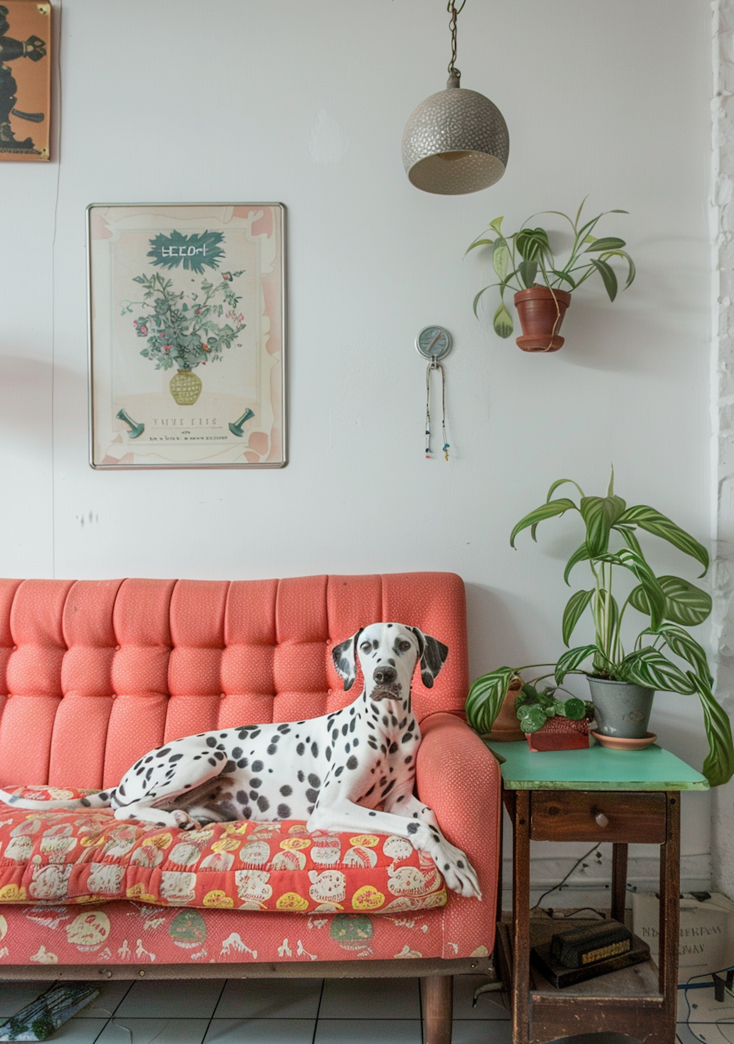Dalmatian lounging on a coral tufted sofa with patterned cushions, surrounded by plants and eclectic decor in a cozy living space.