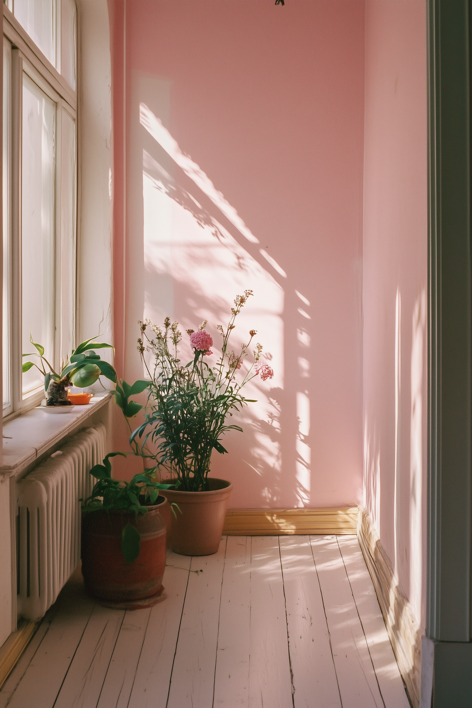 Sunlit pink-walled room with potted plants casting shadows, creating a serene and inviting atmosphere.