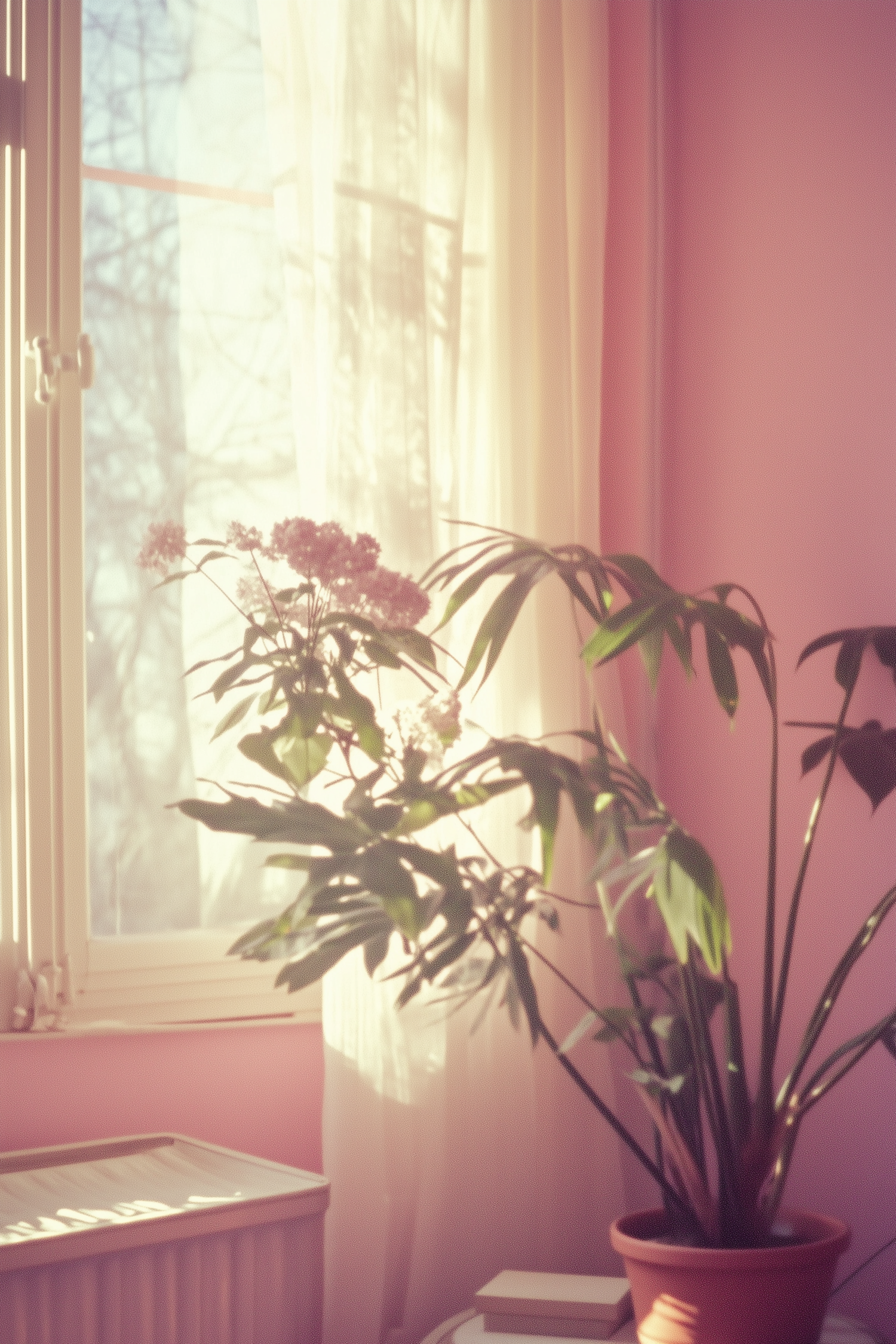 Sunlit room with pink walls, sheer curtains, and a potted plant with pink flowers. Cozy and serene atmosphere.