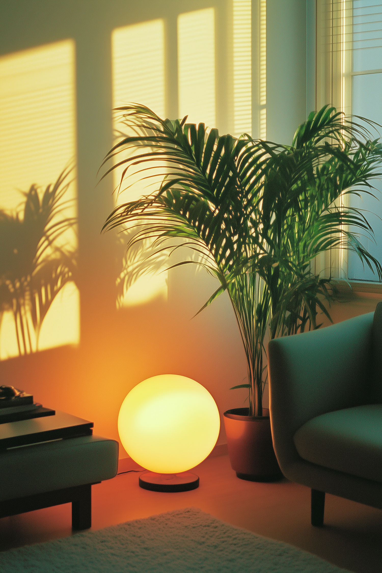 Warm living room with glowing lamp, lush plant, and cozy sofa. Soft shadows and golden light create a serene atmosphere.