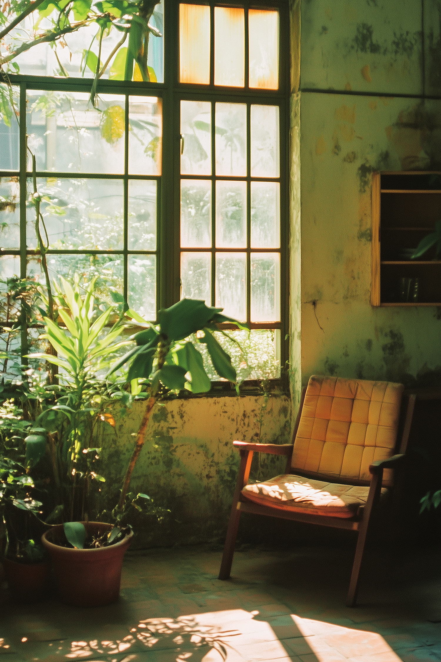 Sunlit room with vintage armchair, lush plants, and rustic window. Cozy, tranquil ambiance with dappled light and aged walls.