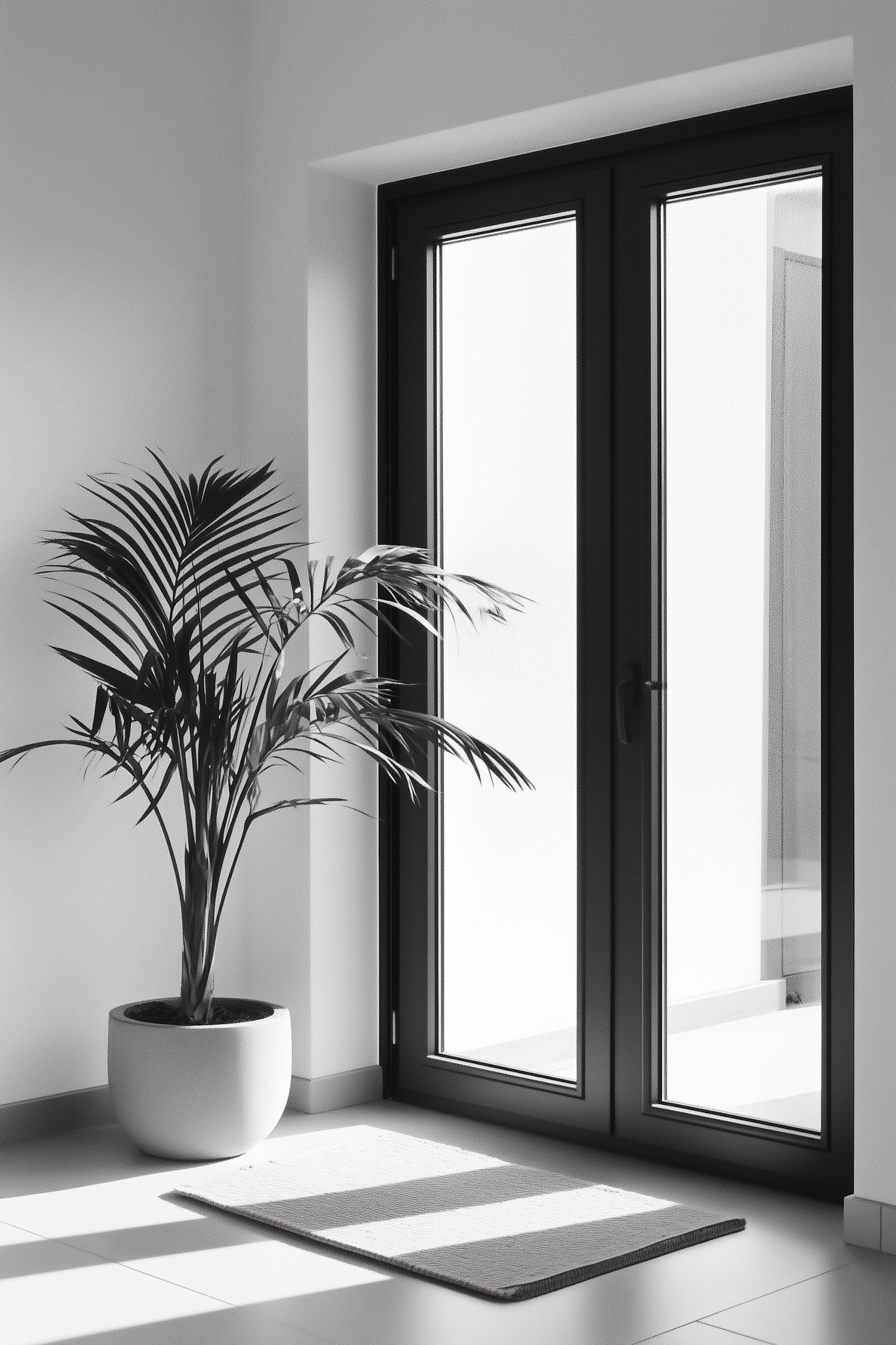 Minimalist interior with a potted plant by a modern glass door, casting shadows on a textured rug. Monochromatic and sleek design.