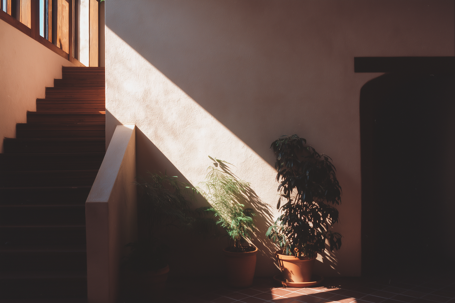 Warm sunlight illuminates a staircase and potted plants in a minimalist indoor space with earthy tones and sharp shadow patterns.