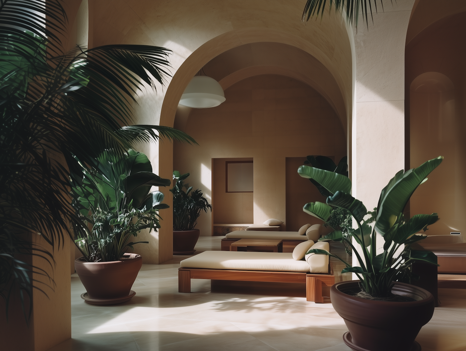 Tranquil indoor space with lush plants, arched ceilings, and elegant loungers. Perfect for relaxation and meditation.