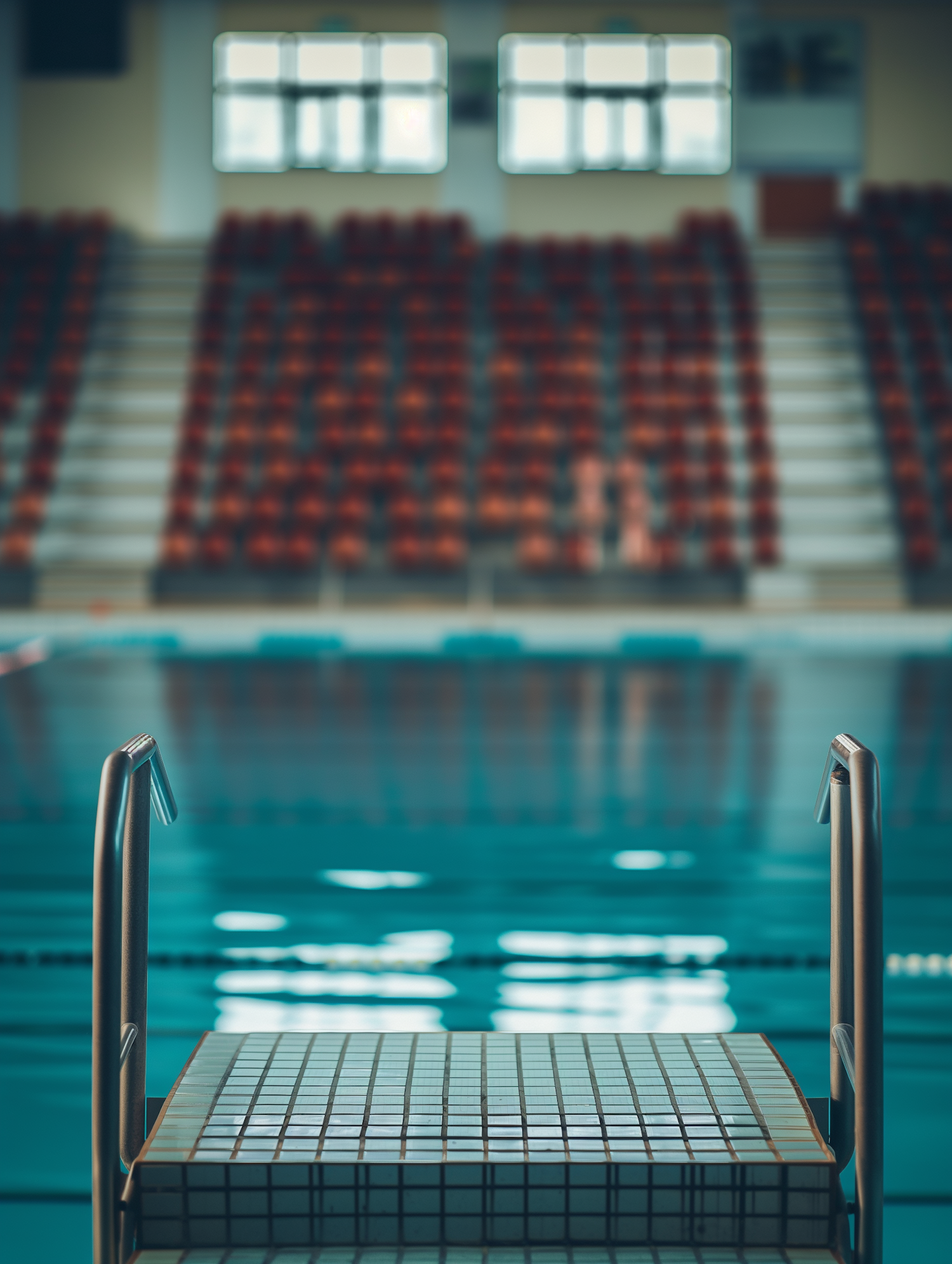 Empty swimming pool with a tiled starting block and metal handrails, set against a backdrop of red spectator seats and large windows.