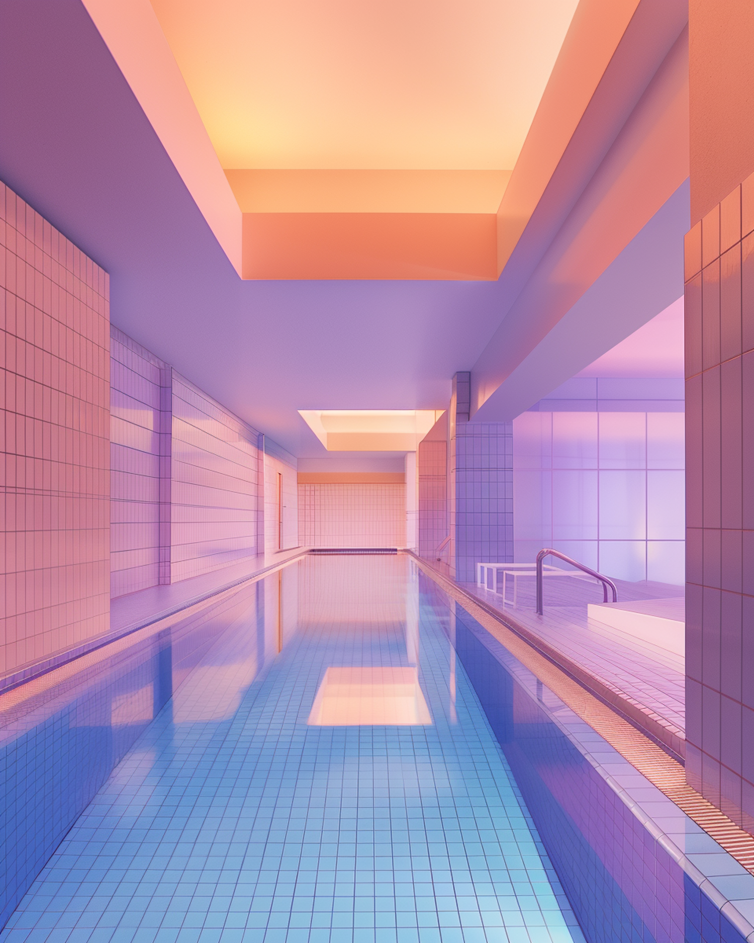 Modern indoor pool with pastel tiles and ambient lighting, creating a serene and inviting atmosphere for relaxation.