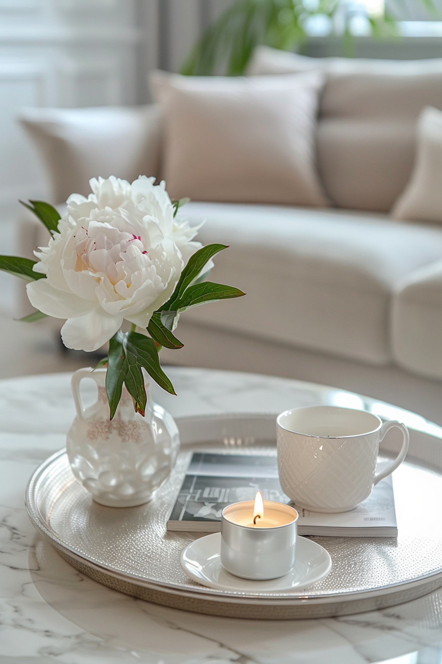 Elegant living room with a marble table, white peony, lit candle, and cozy beige sofa. Perfect for a serene, relaxing atmosphere.