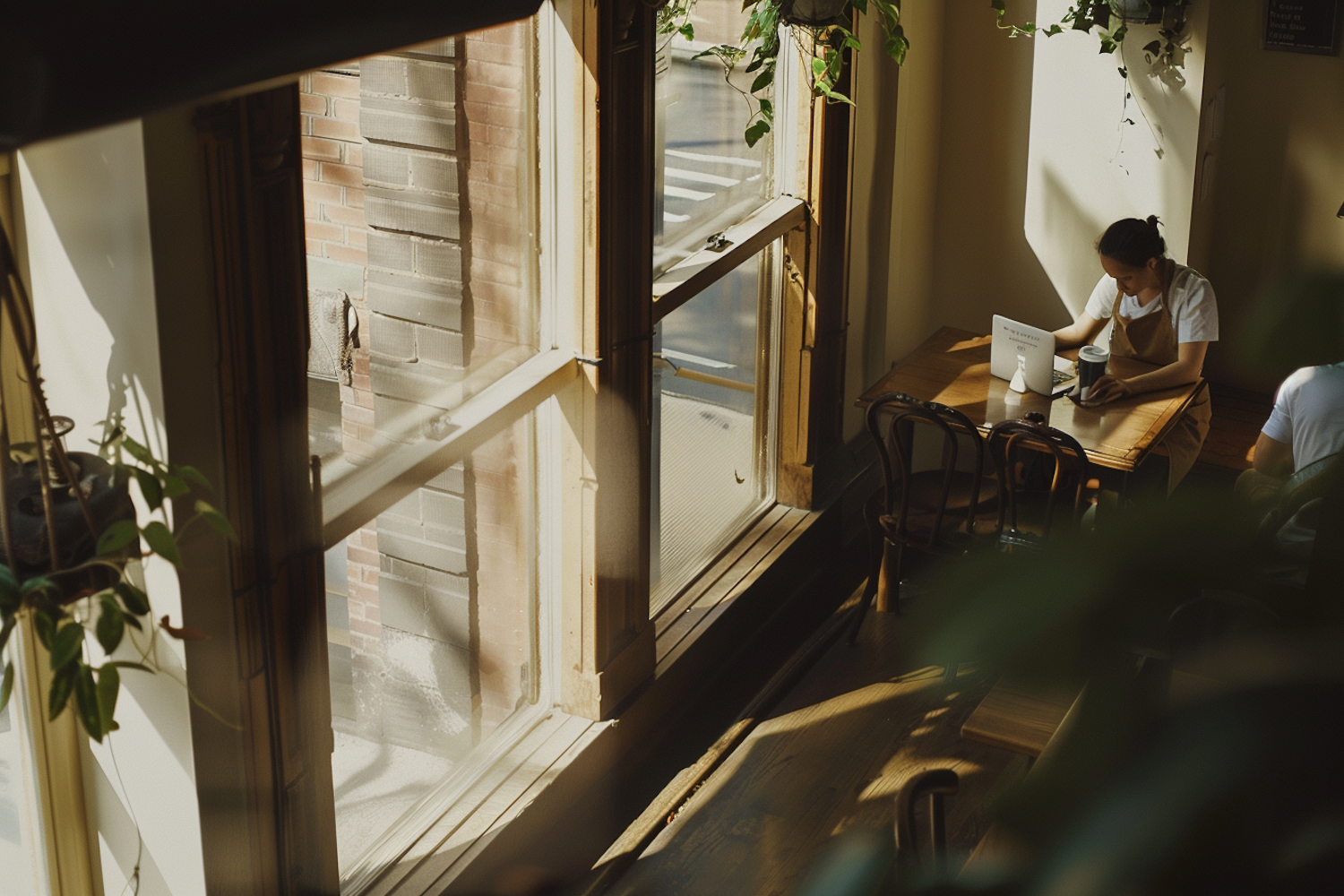 Sunlit cafe with a person working on a laptop, surrounded by plants and warm wooden decor, creating a cozy atmosphere.