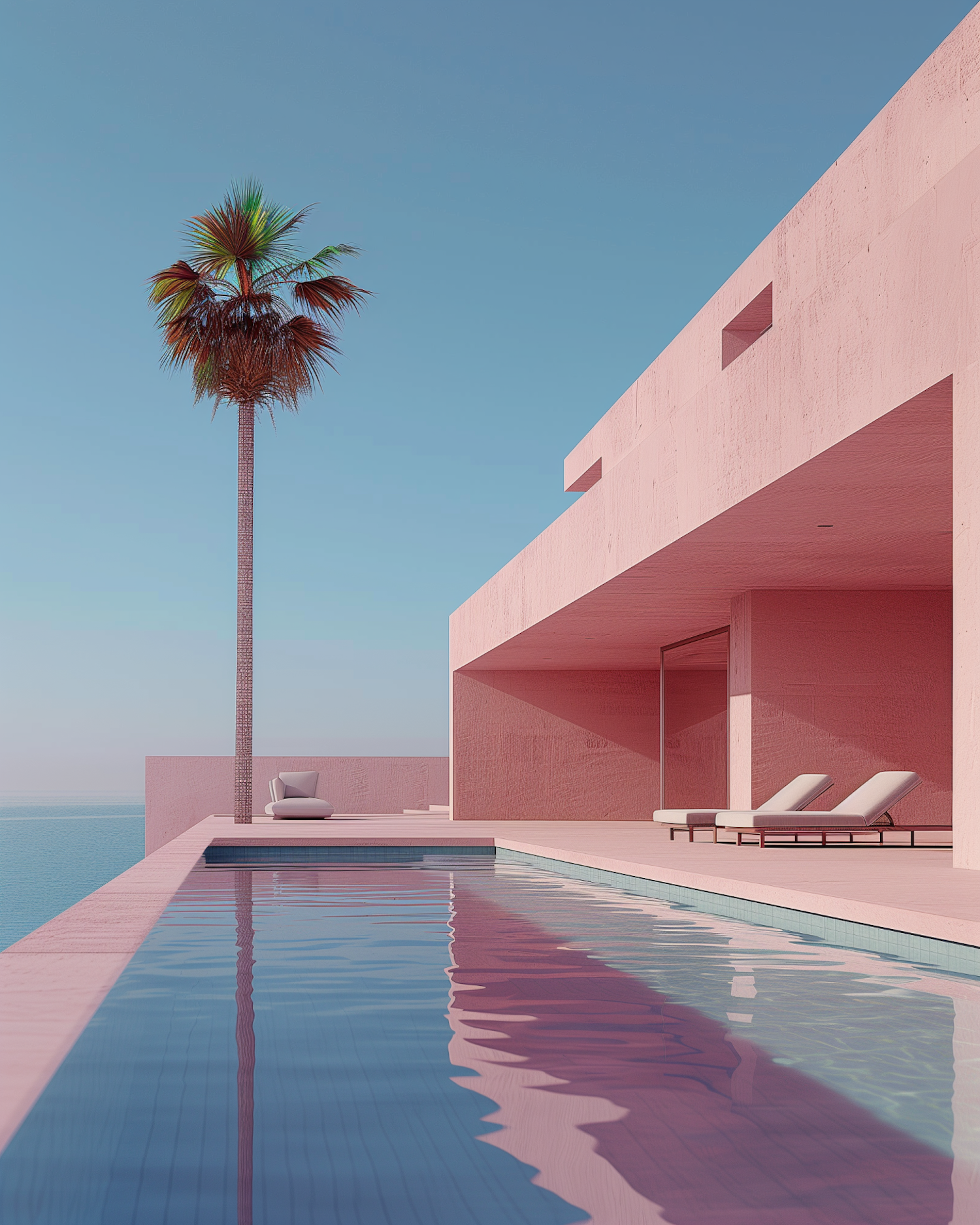 Modern pink concrete architecture with a pool, palm tree, and lounge chairs under a clear blue sky. Minimalist and serene design.