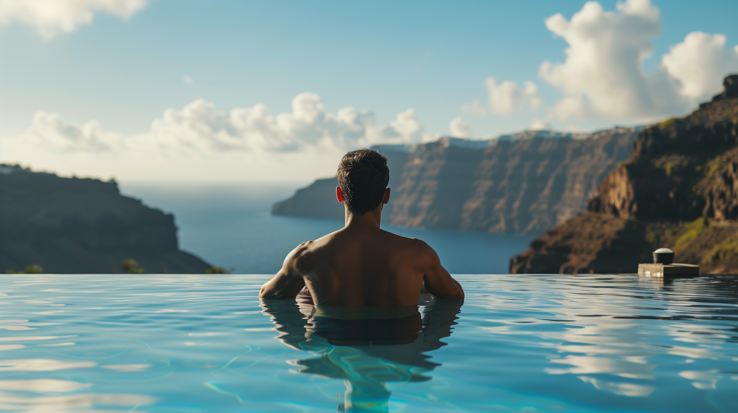 Man in infinity pool overlooking ocean and cliffs, serene and tranquil setting with clear blue water and bright sky.