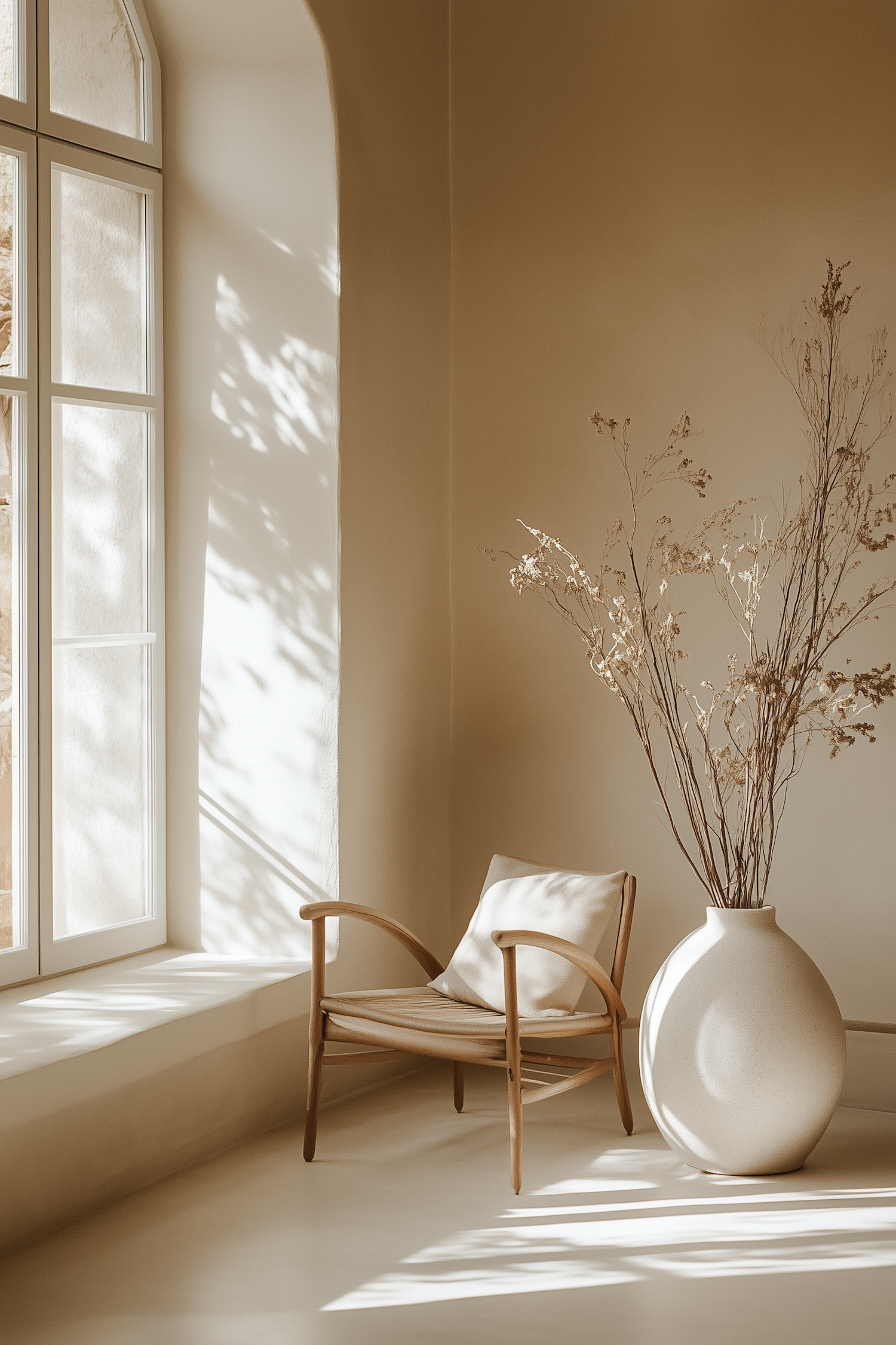Minimalist interior with a wooden chair, large vase, and soft natural light through a window, creating a serene atmosphere.