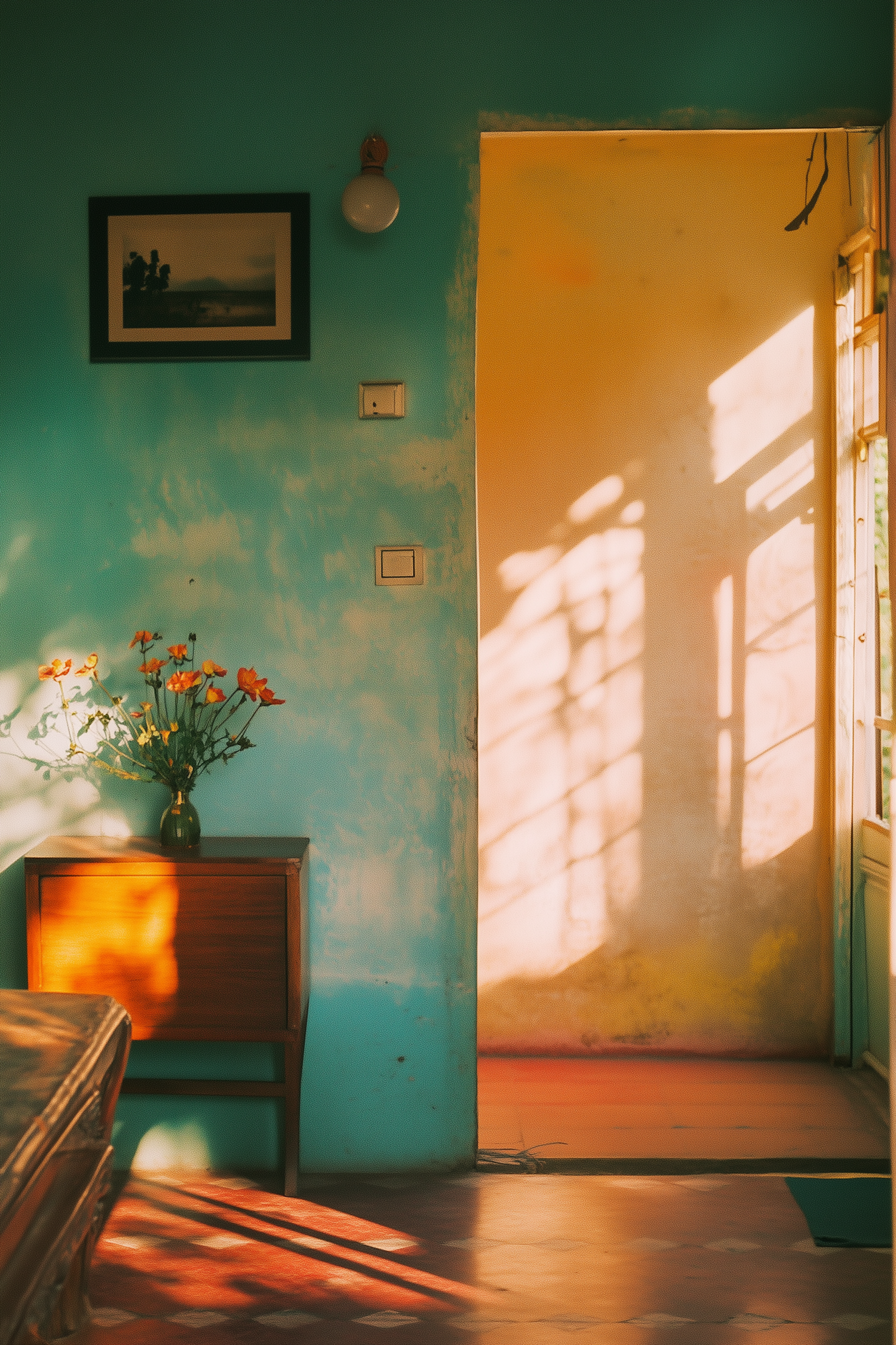 Sunlit room with turquoise walls, wooden table, and vibrant flowers. Warm shadows create a tranquil, vintage ambiance.