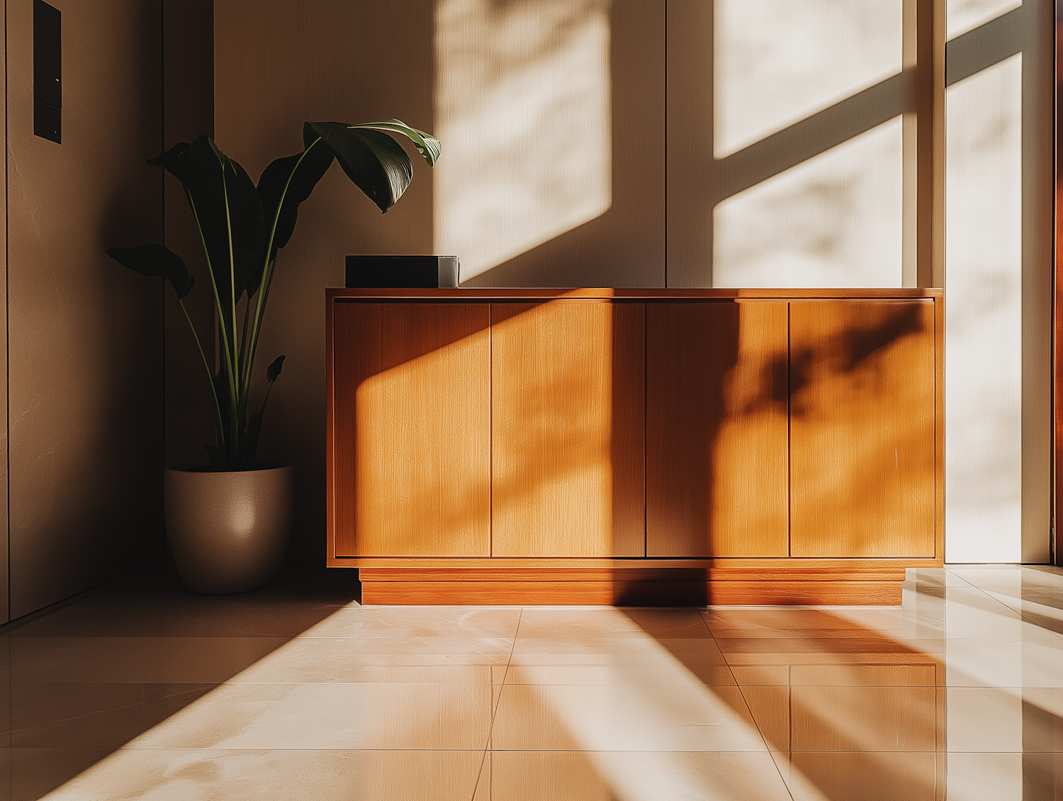 Minimalist interior with wooden cabinet, potted plant, and warm sunlight casting shadows on a polished floor.