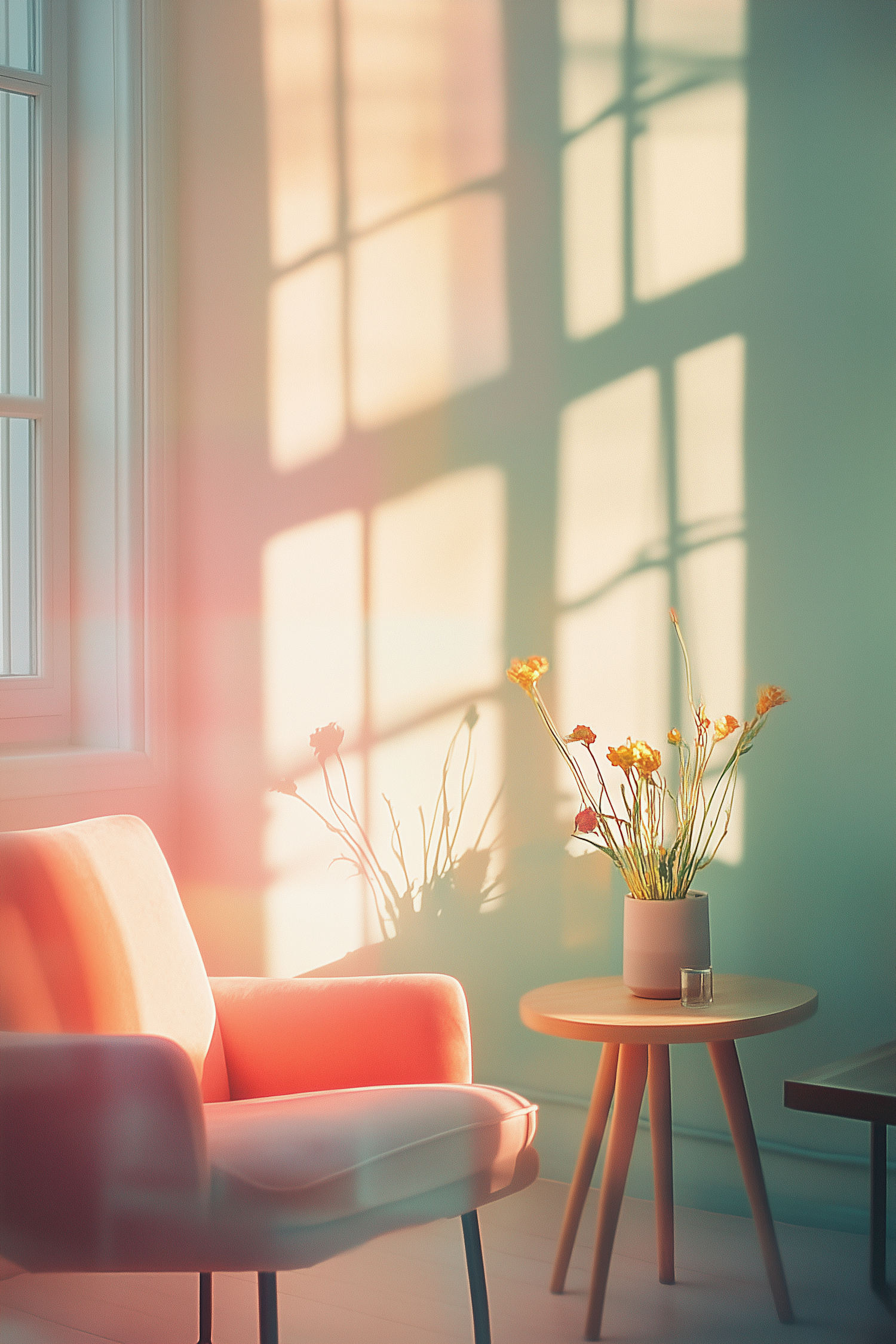 Sunlit room with a pink armchair, wooden table, and yellow flowers in a vase. Soft shadows create a serene, cozy atmosphere.
