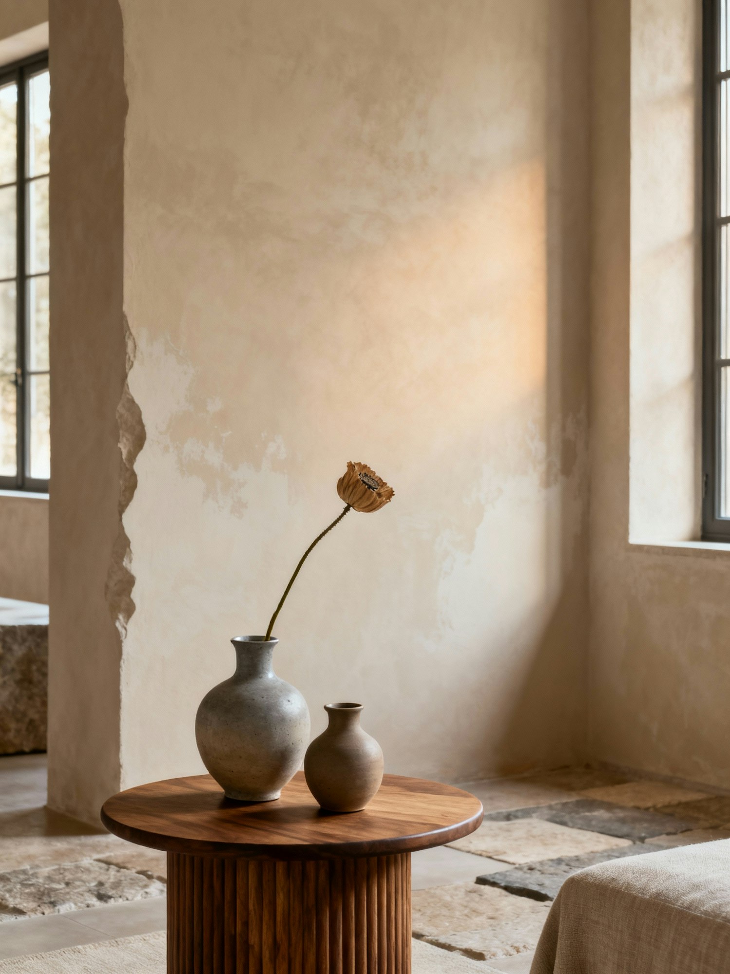 Nordic interior photography, shot in natural daylight — serene and contemplative atmosphere. Soft diffused light from side windows, gentle shadows, warm neutral palette with tones of beige, tan, and muted brown. Use raw and tactile materials like oak wood, linen, stone, brushed metal. Minimal composition with air and negative space. Realistic photo with subtle grain, no overexposure. Architectural framing, calm and timeless design aesthetic inspired by FRAMA — quiet luxury, Scandinavian minimalism, sensory stillness. A small round oak side table with a visibly hand-sanded texture. On its surface, a grey-beige ceramic vase with a single dried poppy stem, and beside it, a smaller jug in matte clay. The wall behind is slightly irregular with subtle limewash texture, catching the faintest gradient of light. The air feels heavy with stillness, as if frozen in late afternoon calm.
