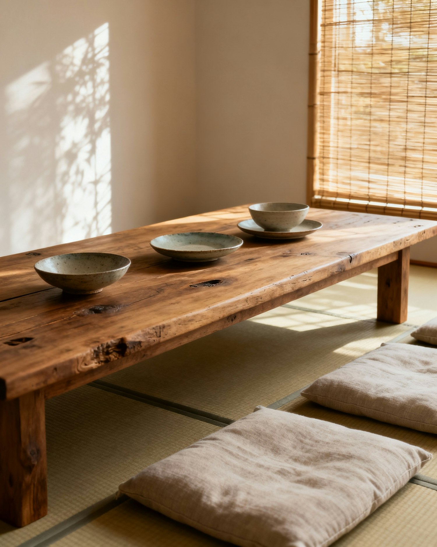 Minimal japanese interior design, wabi-sabi and japandi atmosphere, soft natural daylight, calm and quiet mood, realistic photography, subtle depth of field, balanced composition, minimal styling, handcrafted furniture, natural imperfections, organic forms, slow living aesthetic, editorial interior photography style A traditional japanese dining room with a long low wooden table, floor seating with linen zabuton cushions, tatami floor, simple ceramic bowls and plates, soft sun filtered through bamboo blinds