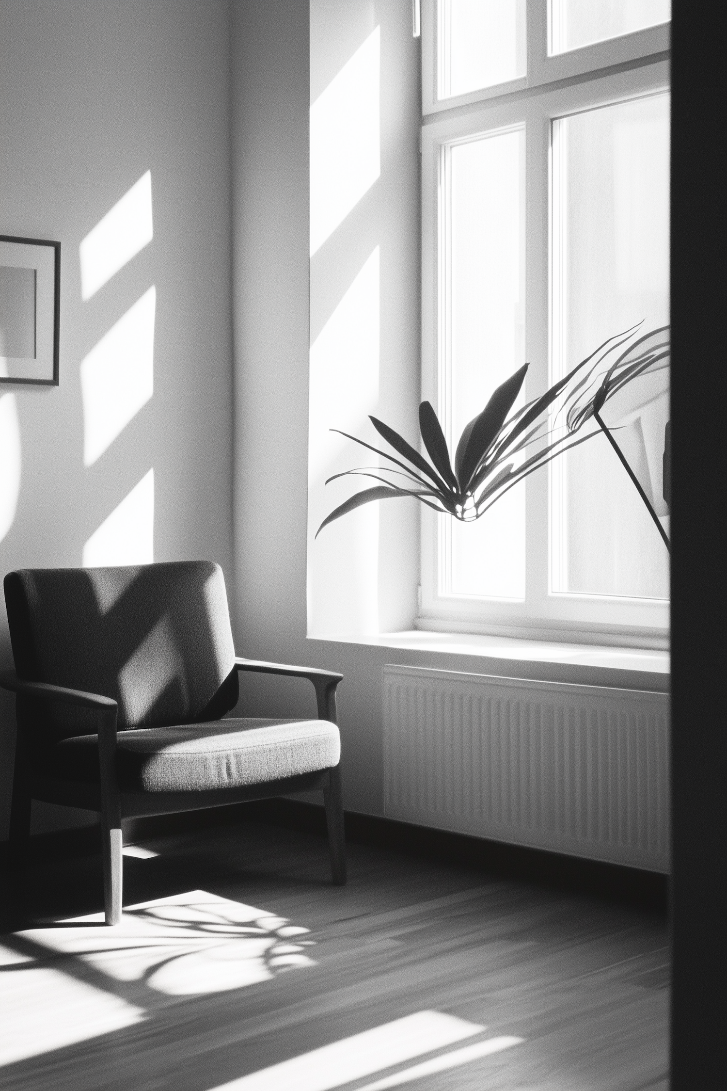 Minimalist room with a modern armchair, large window, and plant casting shadows on a wooden floor, creating a serene atmosphere.