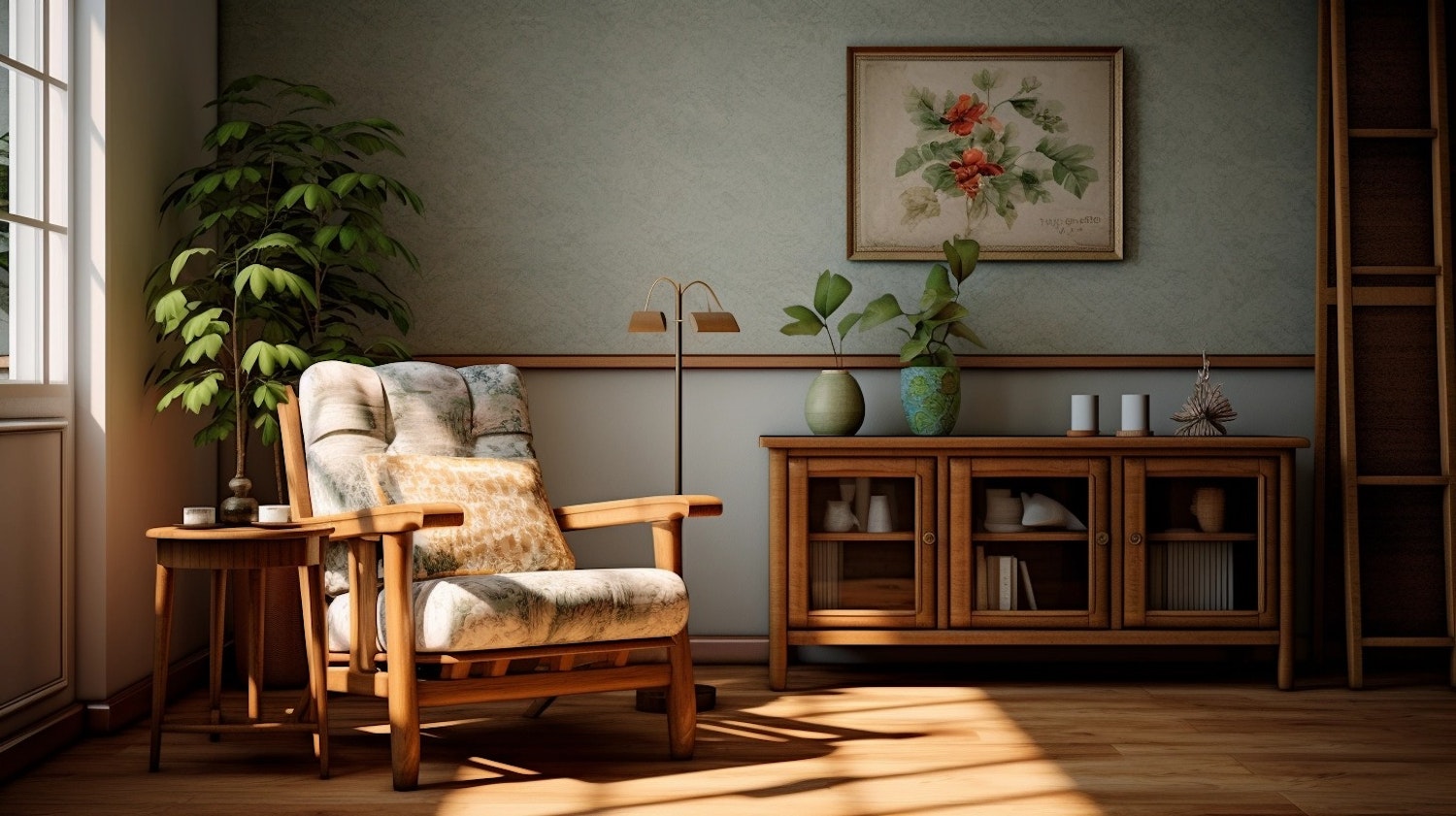 Cozy living room with a floral armchair, wooden furniture, and a leafy plant, bathed in warm sunlight for a serene ambiance.