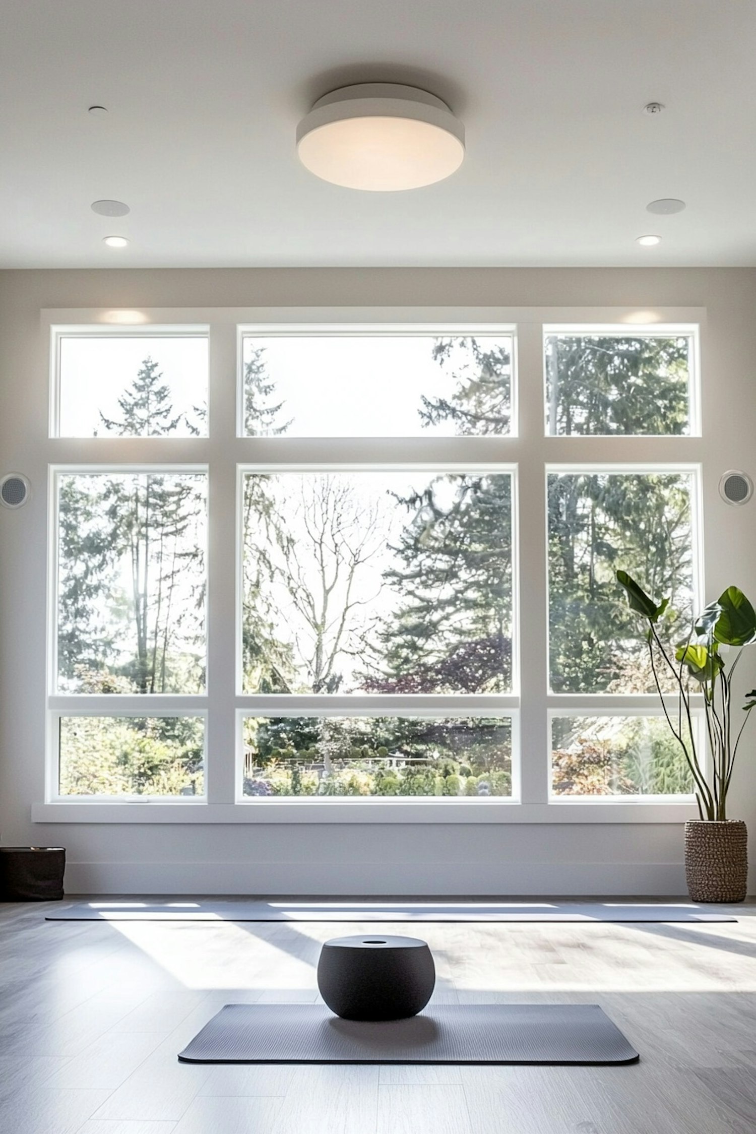 Minimalist room with large windows, meditation cushion, and potted plant. Bright, airy space ideal for relaxation or yoga.