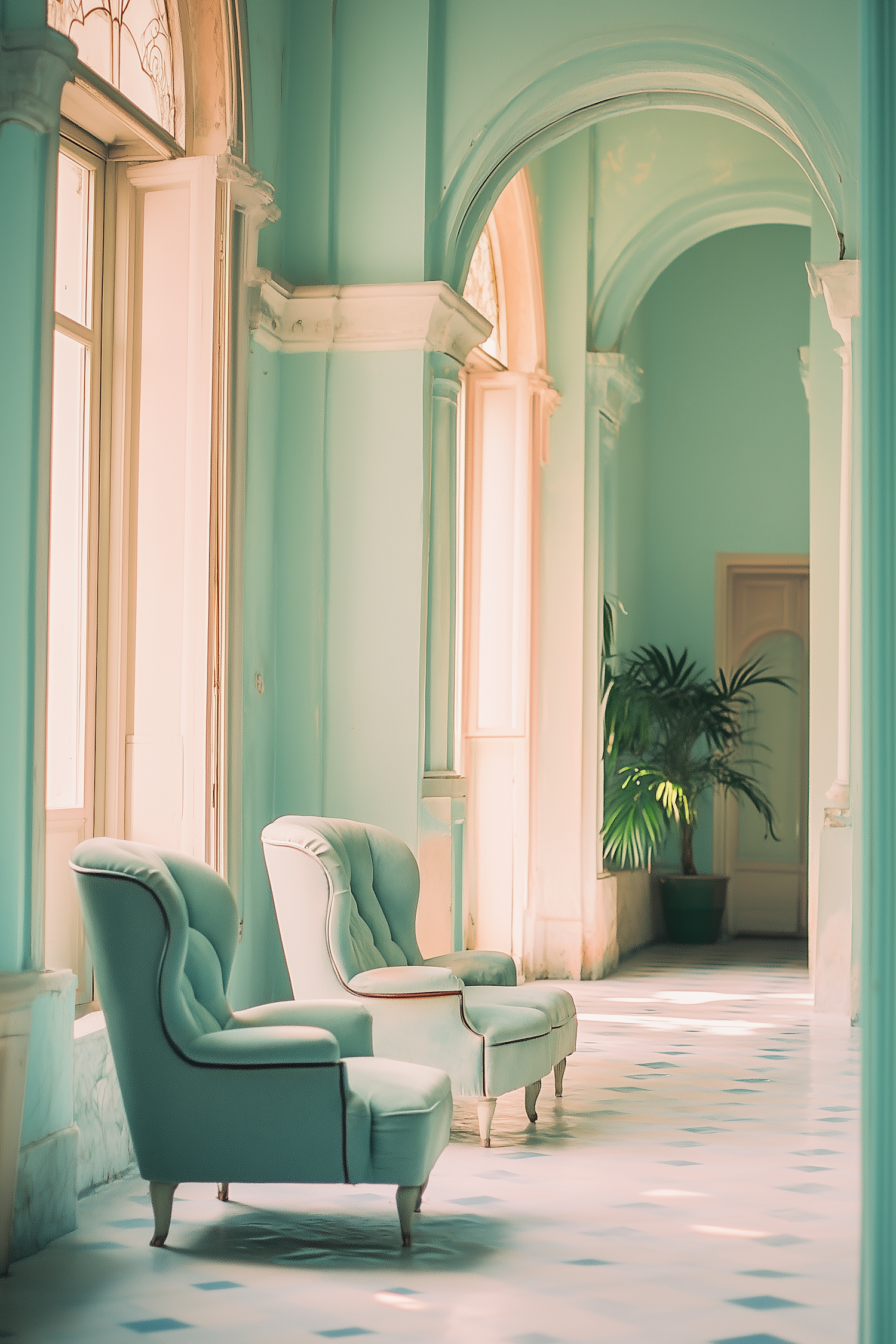 Elegant turquoise armchairs in a serene, pastel-toned interior with arched windows, tiled floors, and a potted palm for a tranquil vibe.