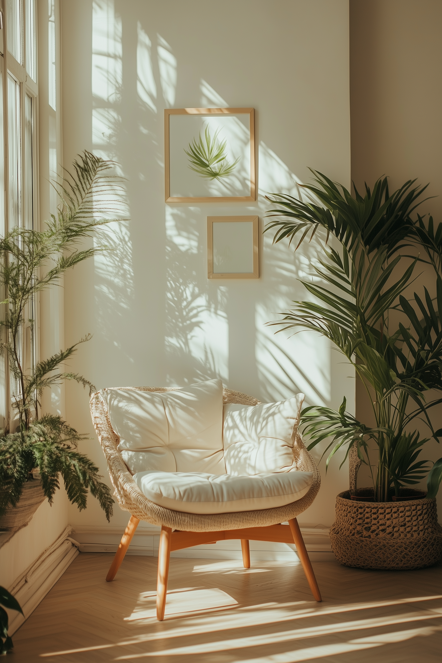 Sunlit room corner with a wicker chair, white cushions, and lush plants casting shadows on the wall. Botanical prints add a natural touch.
