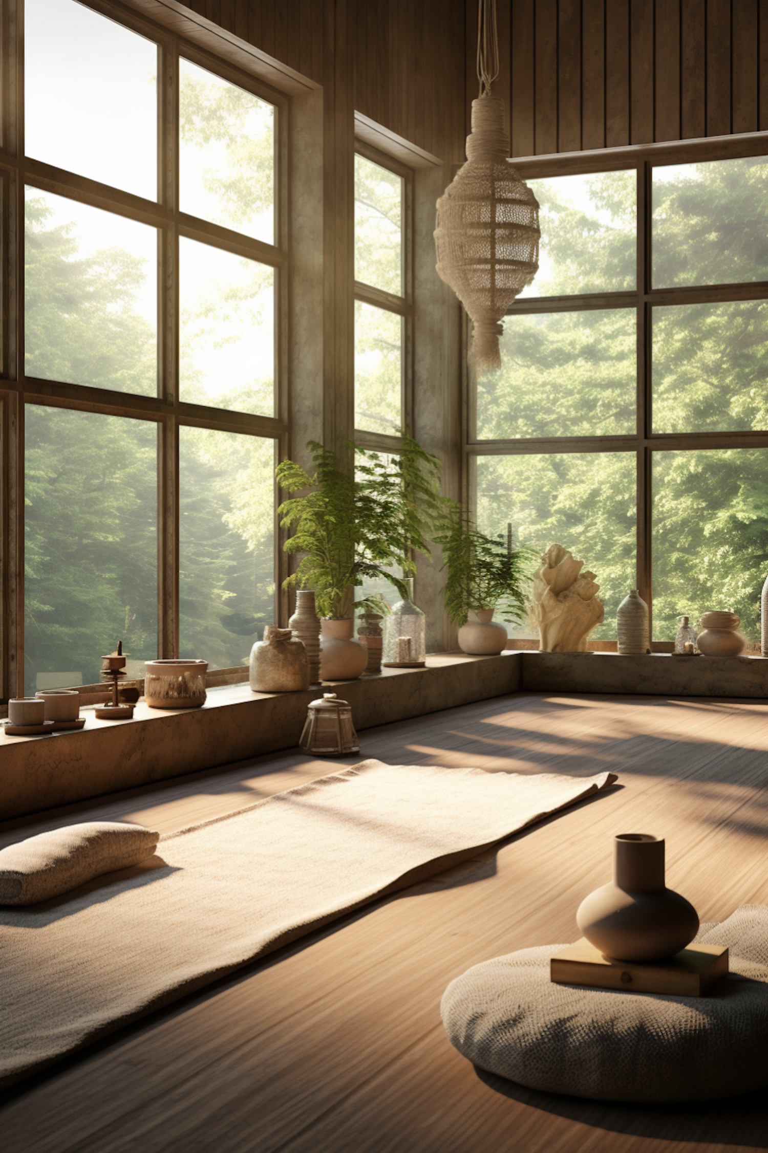 Serene interior with large windows, natural light, earthy tones, and minimalist decor. Features plants, vases, and a cozy seating area.