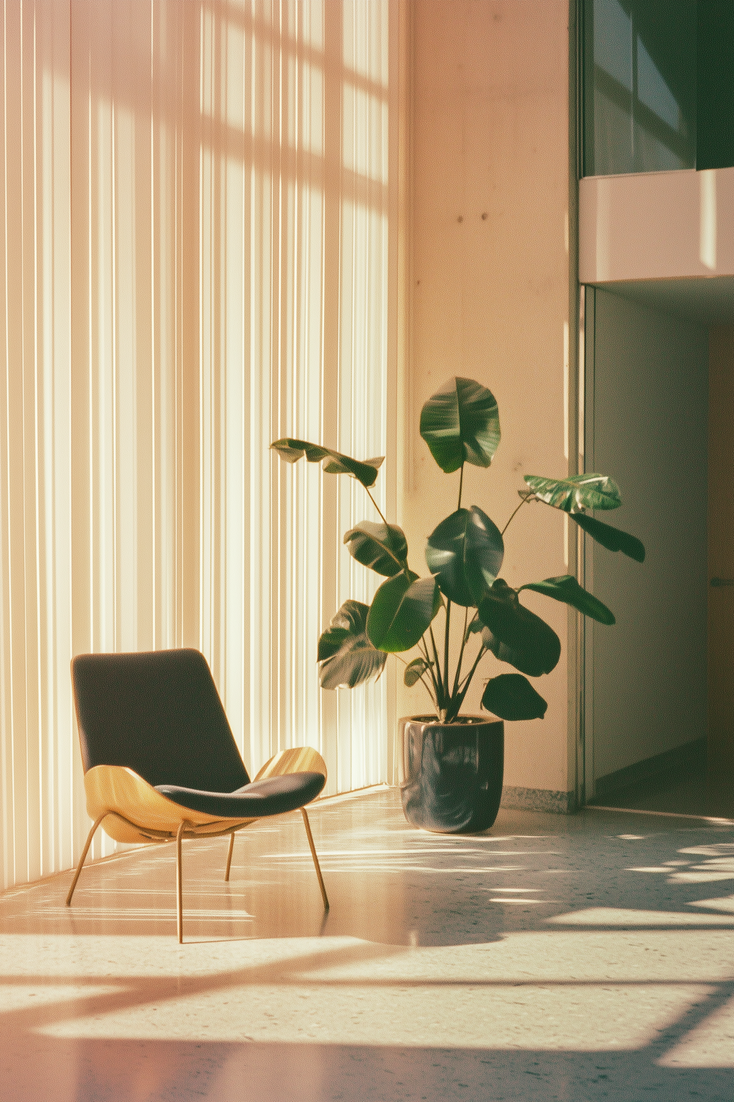 Sunlit modern interior with a sleek chair and lush potted plant, creating a serene and minimalist atmosphere.