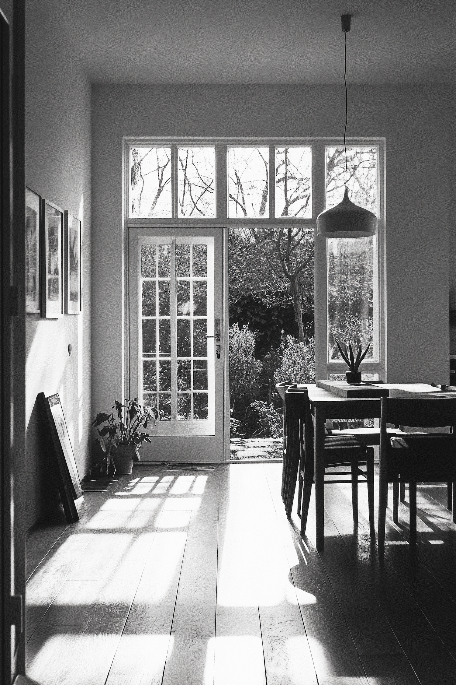 Sunlit room with glass door, wooden floor, dining table, and garden view. Minimalist decor with framed pictures and a potted plant.