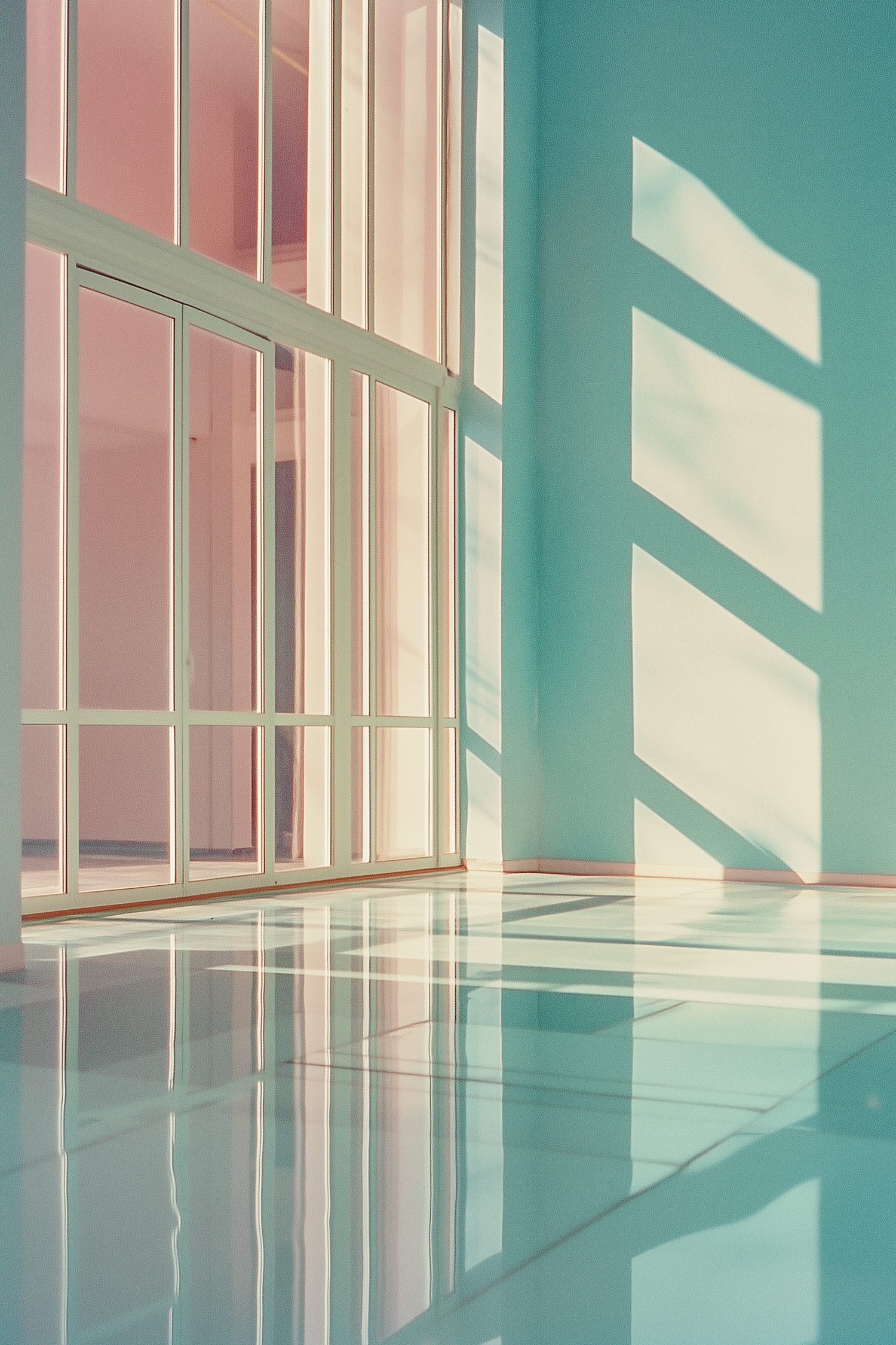 Sunlit room with tall windows, pastel blue walls, and glossy floor creating a serene and airy atmosphere with geometric shadows.