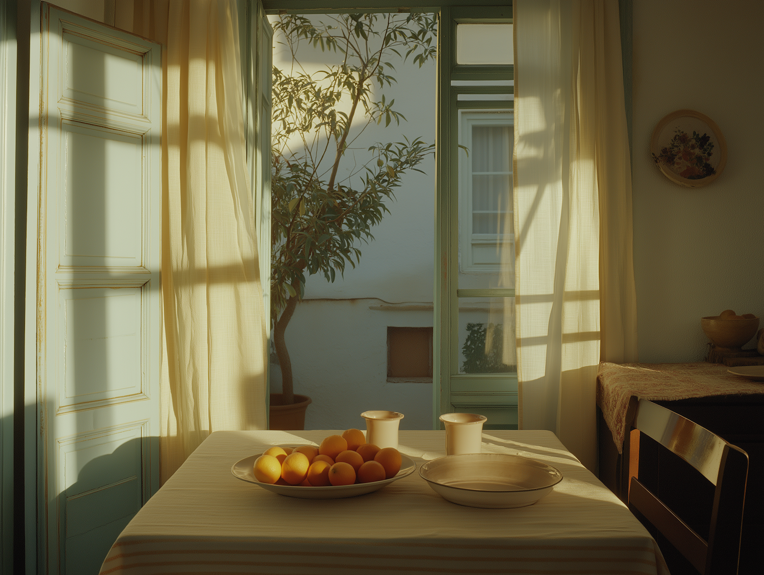 Sunlit kitchen with apricots on a table, sheer curtains, and a potted plant outside. Warm, inviting atmosphere with rustic charm.