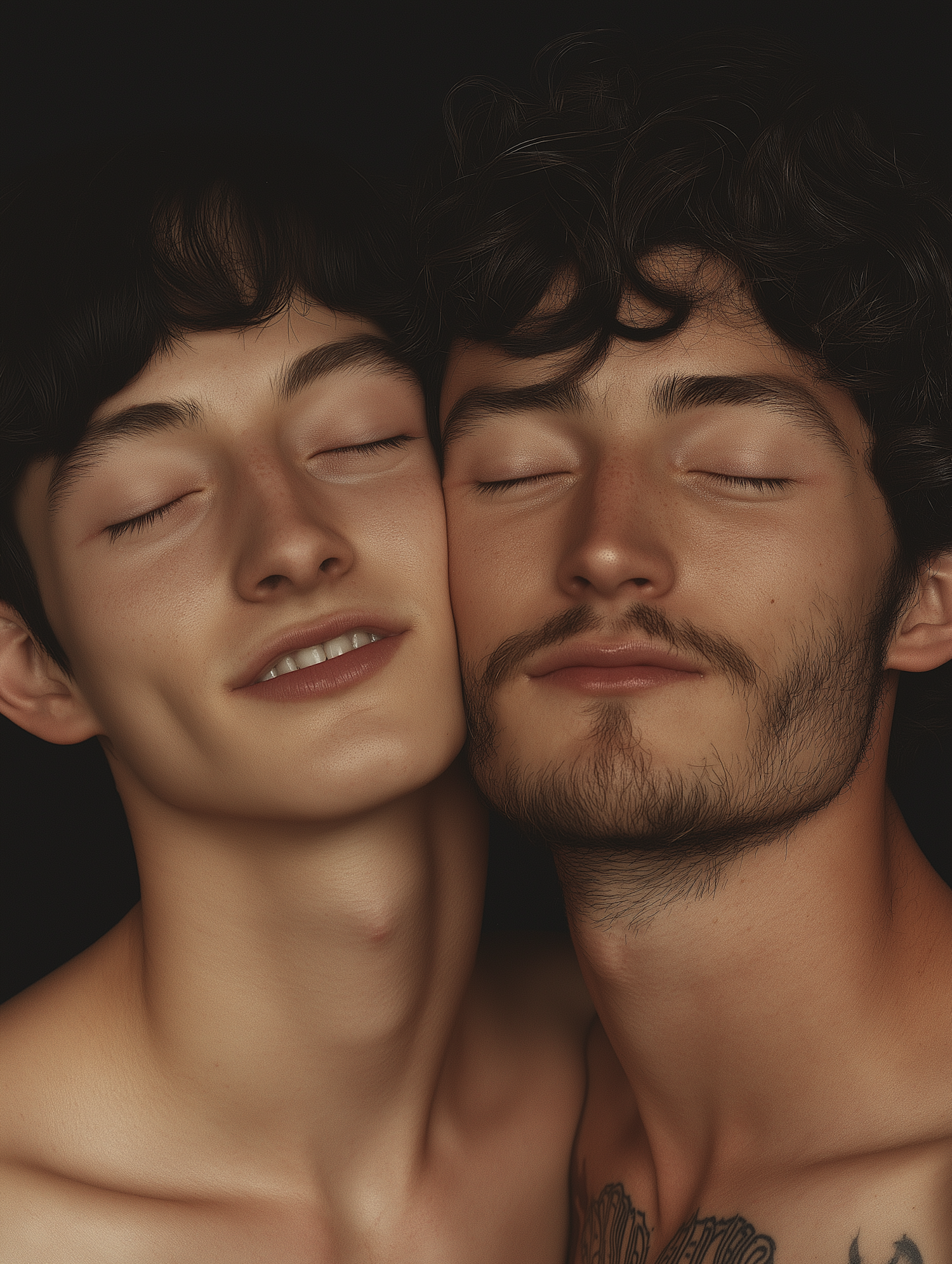 Two young men with closed eyes embrace closely, exuding warmth and serenity against a dark background.