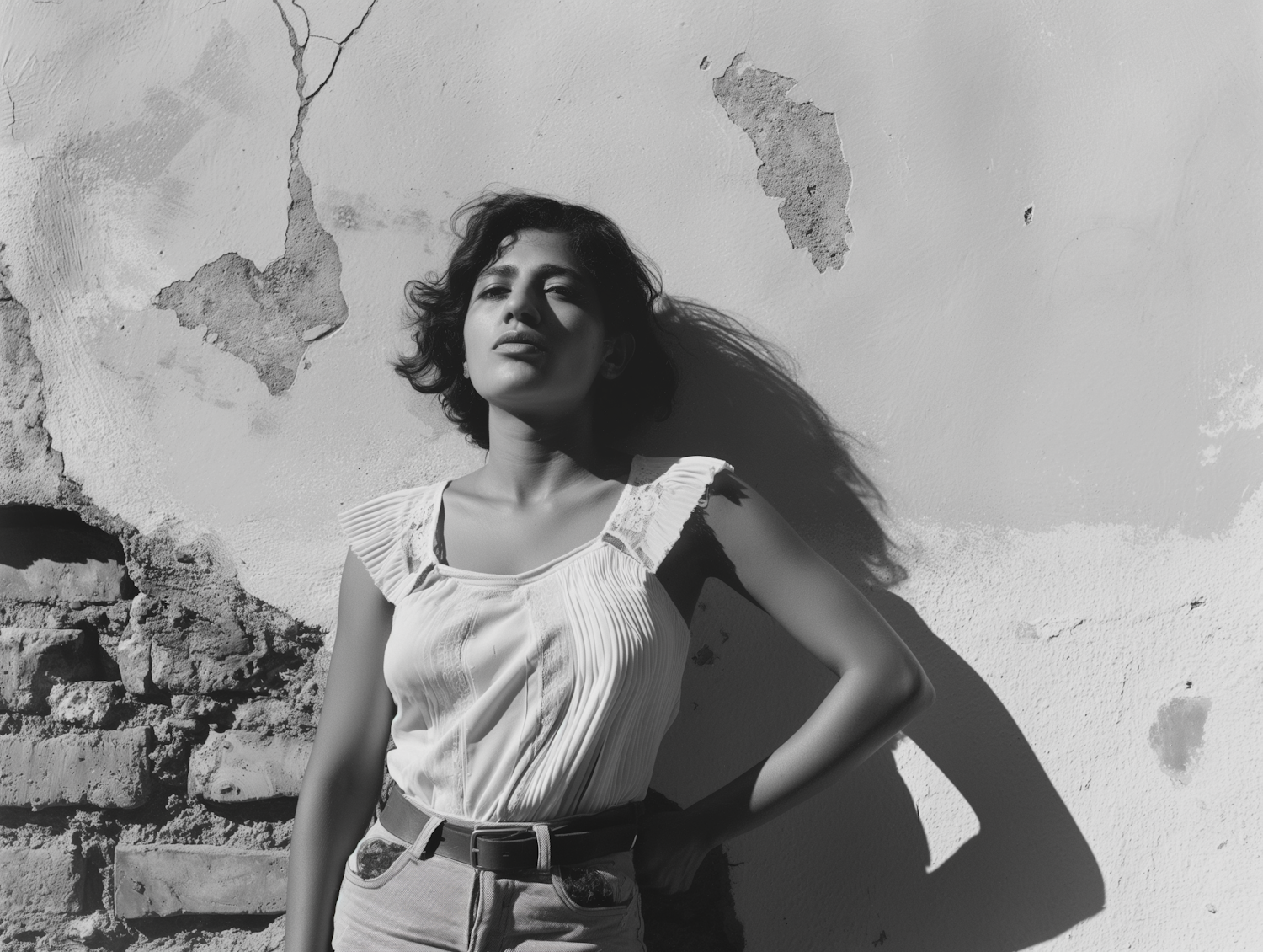 Monochrome portrait of a woman in a white blouse against a textured wall, casting a dramatic shadow.