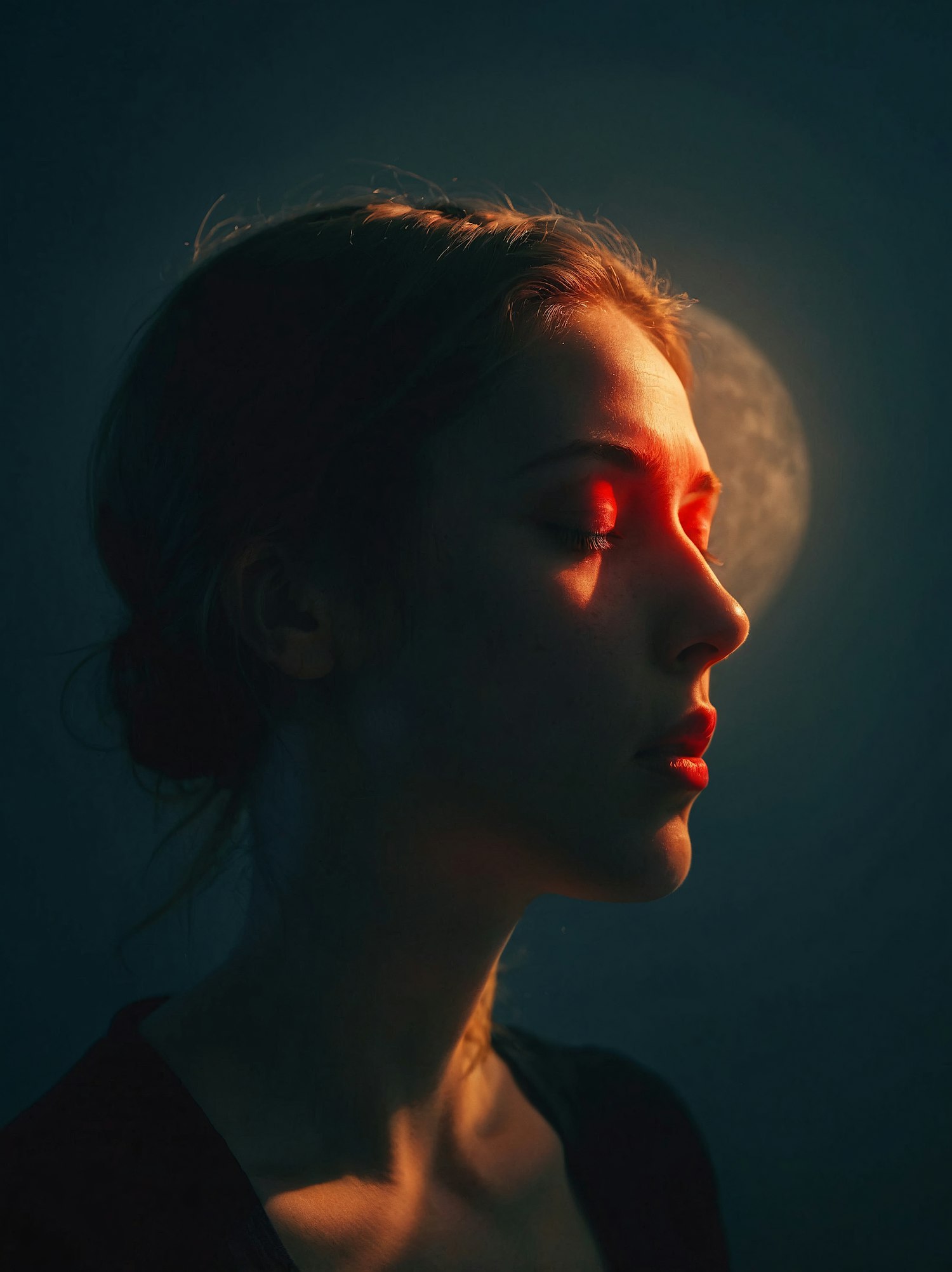 Profile of a woman with red light on her face, eyes closed, against a dark background with a full moon.