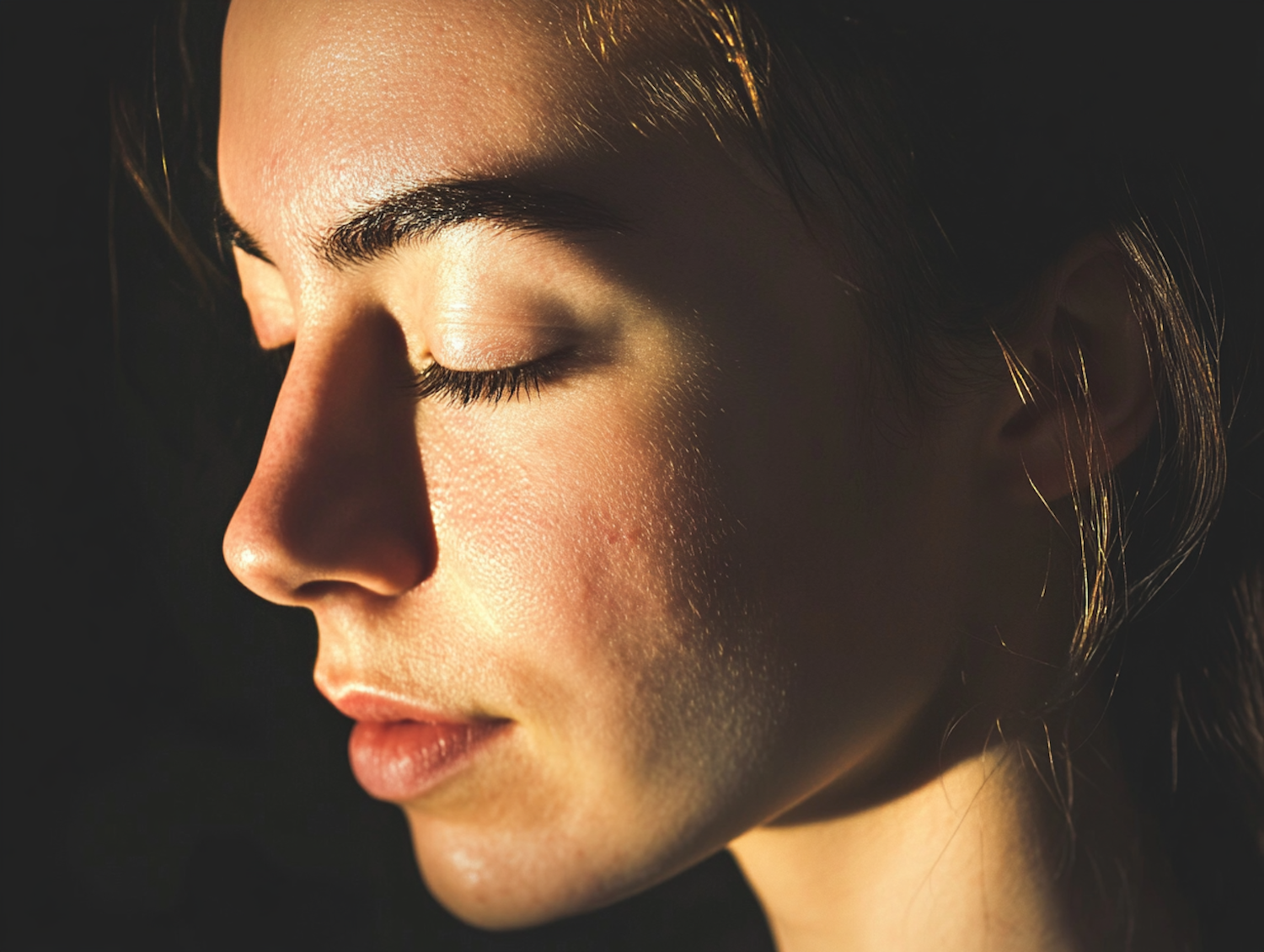 Close-up of a serene woman with closed eyes, warm lighting highlights her smooth skin and delicate features against a dark background.