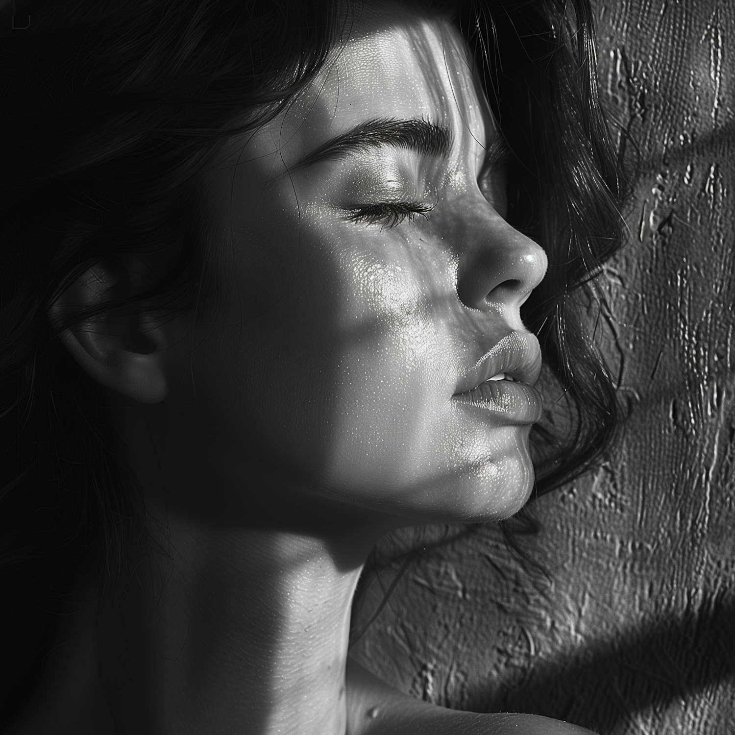 Black-and-white portrait of a serene woman with dramatic lighting and textured background, emphasizing contours and shadows.