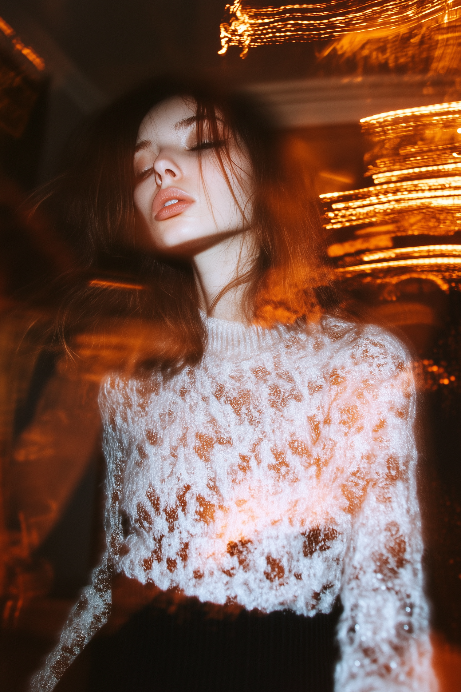 Dreamy portrait of a woman in a white sweater with golden light trails and blurred motion effects creating an ethereal atmosphere.