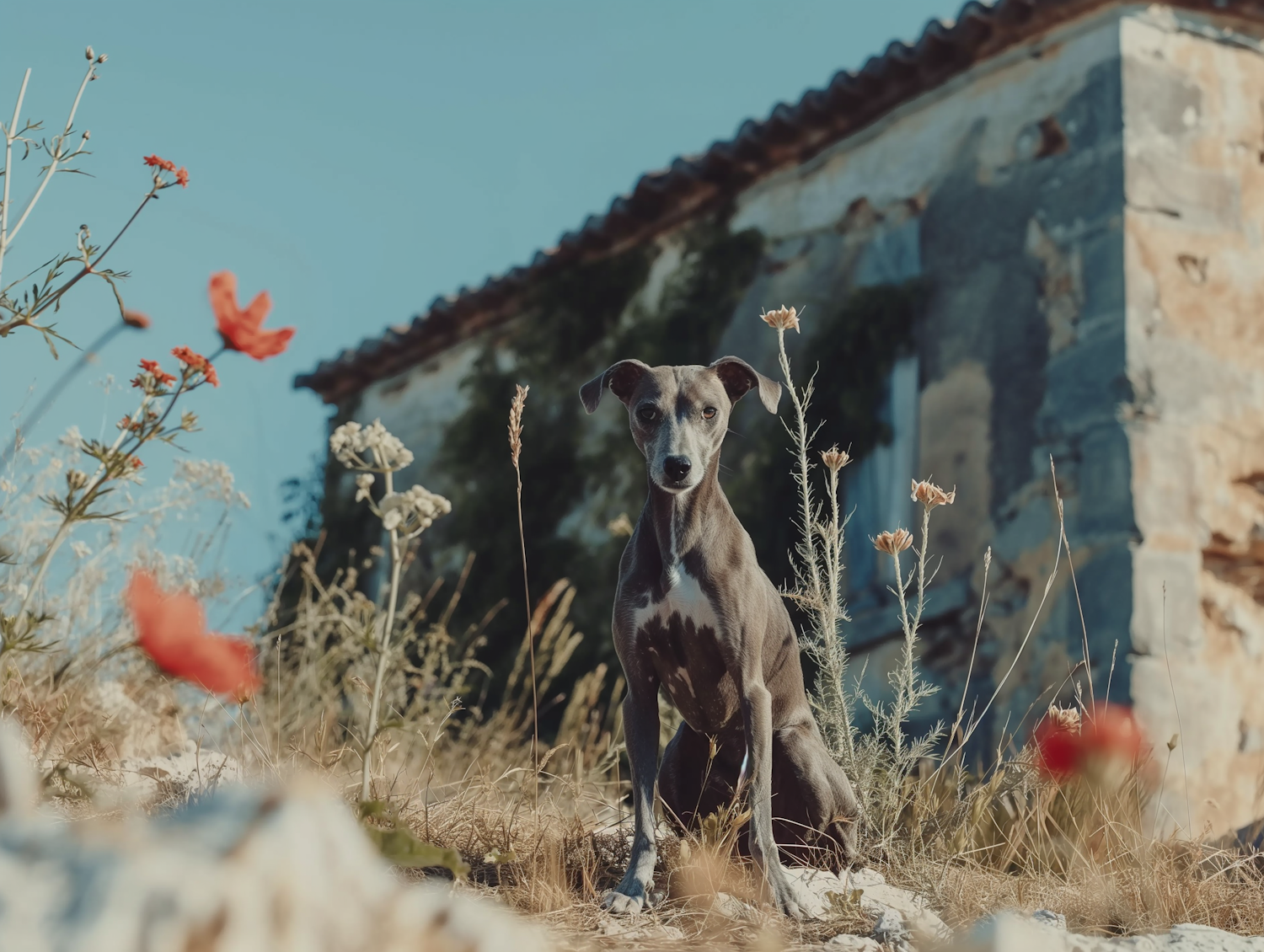 Italian Greyhound in a field of wildflowers with a rustic stone building in the background, under a clear blue sky.