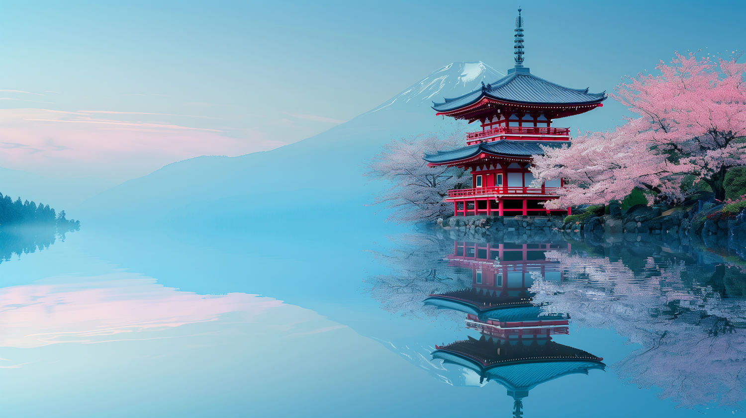 Serene Japanese landscape with a red pagoda, cherry blossoms, and a snow-capped mountain reflected in calm waters.