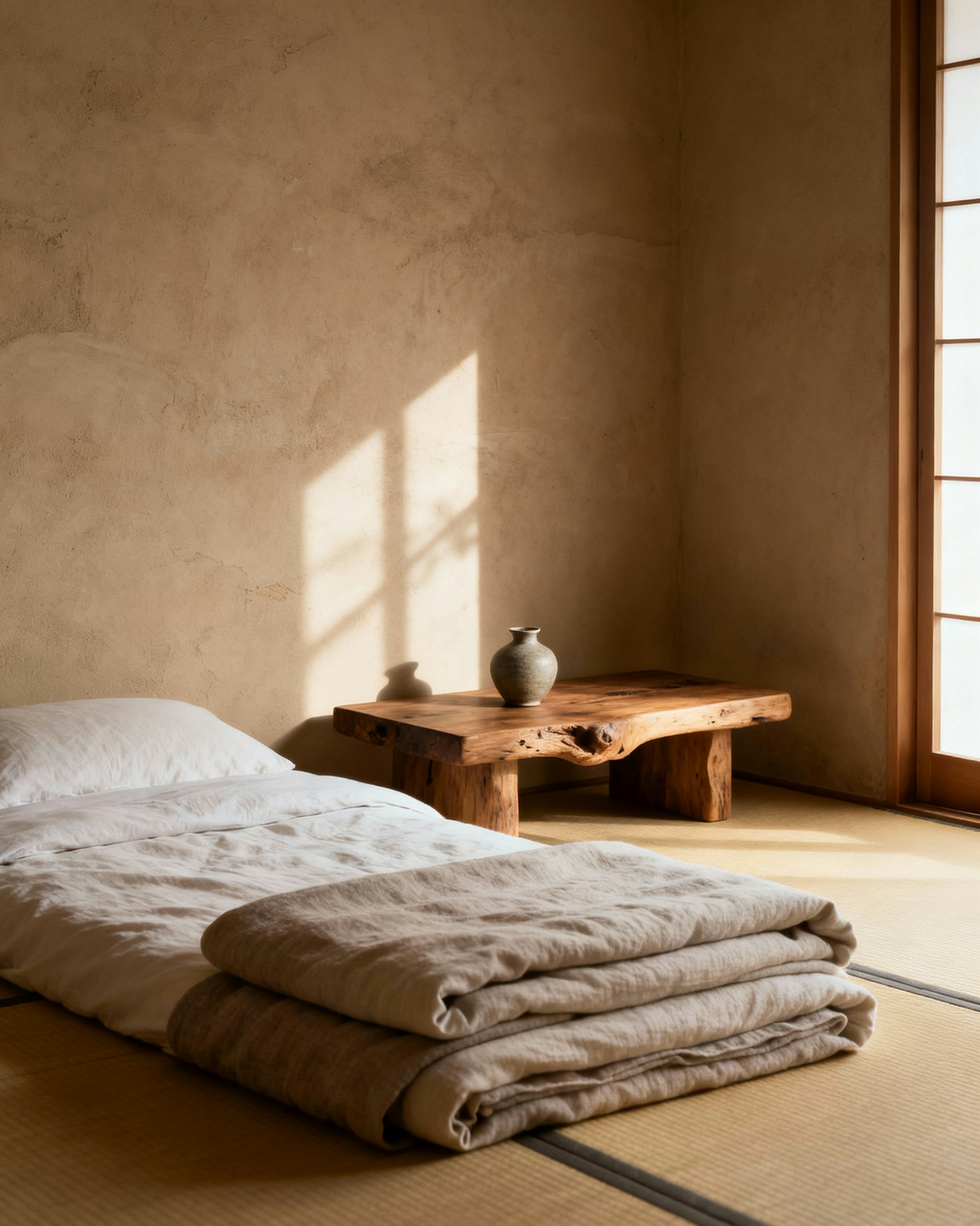 Minimalist Japanese-style room with a futon on tatami mats, a rustic wooden table, and soft natural light through a shoji screen.