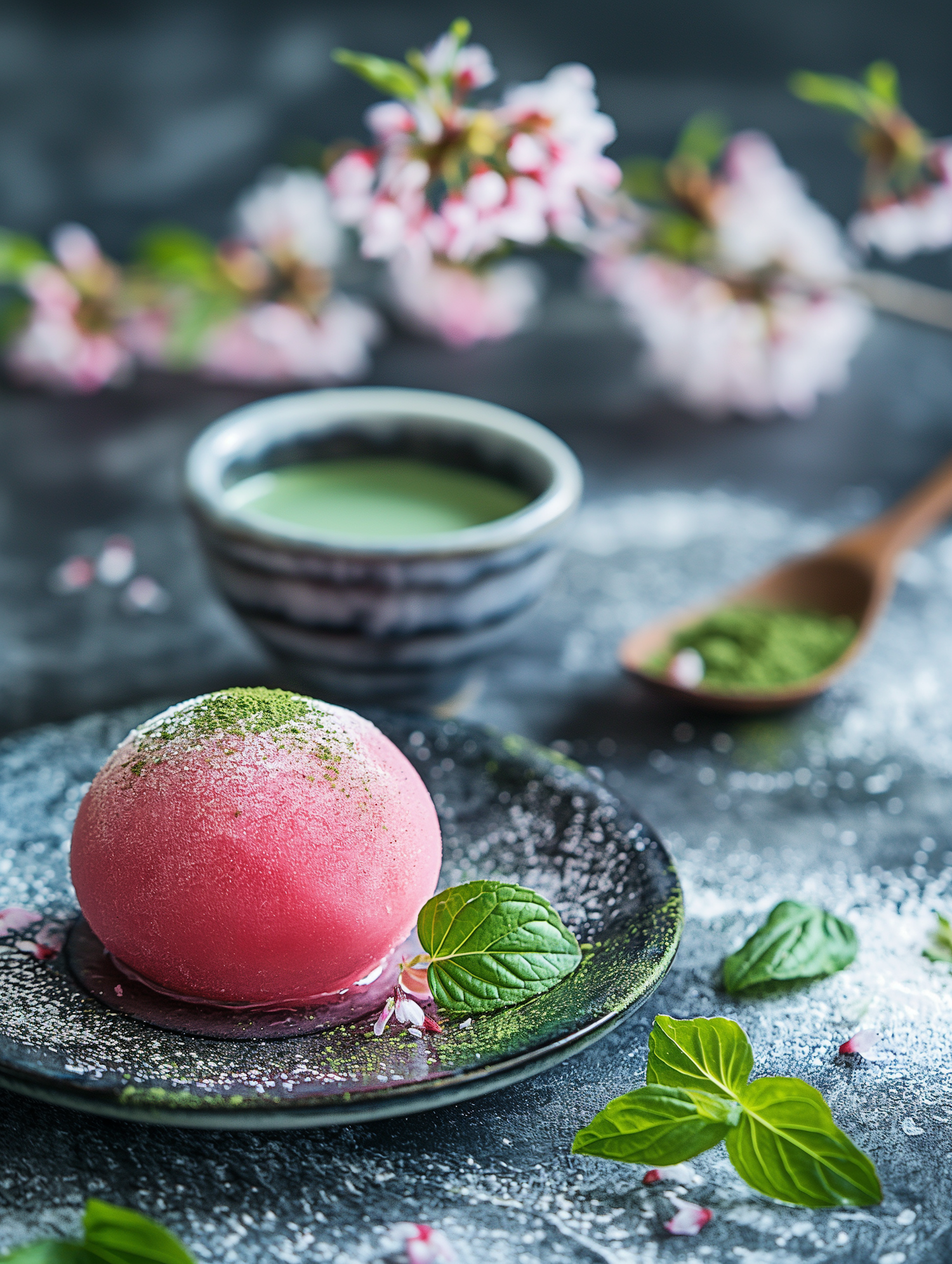 Pink mochi with matcha powder on a plate, surrounded by mint leaves, green tea, and cherry blossoms for a Japanese dessert theme.