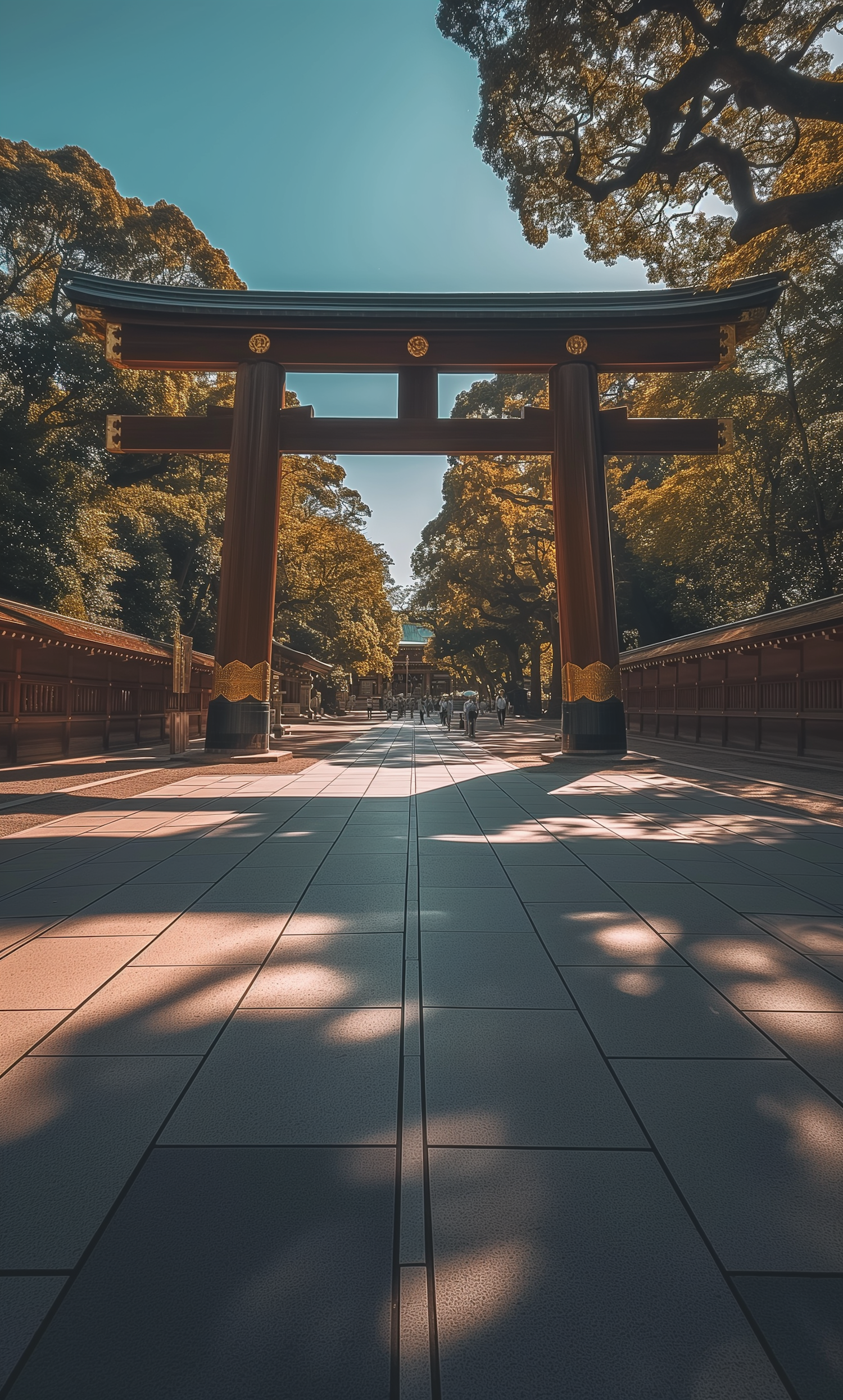 Majestic torii gate under a clear blue sky, surrounded by trees and a stone pathway leading to a traditional Japanese building.