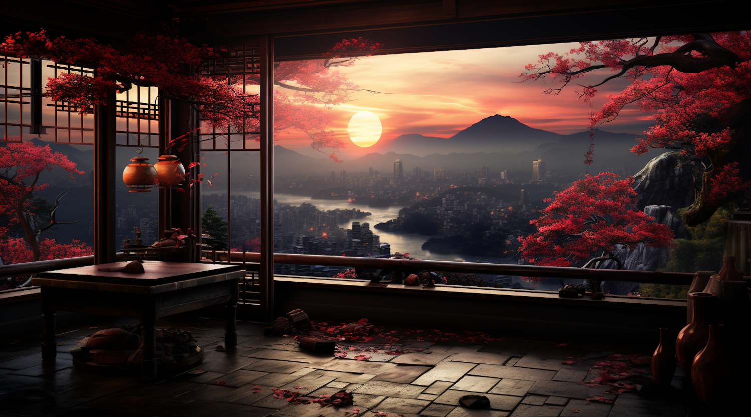 Tranquil Japanese room with a stunning sunset view over a cityscape, framed by vibrant red maple trees and distant mountains.